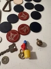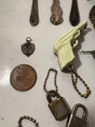 A mixed assortment of vintage odds and ends. Includes three antique silverplate utensils, older keychains, including an old Donald Duck keychain and a puzzle “train” attached to a small knife, random poker chips, some Missouri sales tax tokens, an antique religious medal with American colors on it (military?), a Coca Cola advertising bottle opener, and more. Please note that the items have varying amounts of wear and tear, including damage (the sword lapel pin near the bottom is missing a post, the jack in the box keychain on a spring can’t be loaded back inside the box, etc) and general wear from age. Please see photos, sold as is. 1/6/25 10/13/23 Mixed