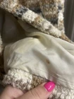 Vintage Mohair Blend Gold Blazer. No size tag but I’m a large and it fits me. A small tear in the liner only (pictured) and a small stain on the bottom of the liner. Cannot be seen while worn. Has a button in the front. Other listings show it as 50% rayon, 20% mohair, 15% lambs wool and 15% polyester. Dry clean only.