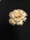 This vintage Monet brooch pin features a stunning sunflower design in goldtone, measuring 1.90\". The piece is signed and perfect for Christmas, anniversary or birthday gifts. The brooch belongs to the Flowers & Plants theme and is made by Sunflower brand. The item is pre-owned and has a vintage touch to it.