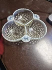 This vintage candy dish is a beautiful example of Moonstone Opalescent glassware. The dish features a triangular shape with three compartments, perfect for serving relish or candy. The clear and white glass is adorned with a Hobnail pattern, adding a touch of elegance to any table setting. This divided dish is a charming piece of decorative cookware that would be a lovely addition to any collection of vintage glassware.