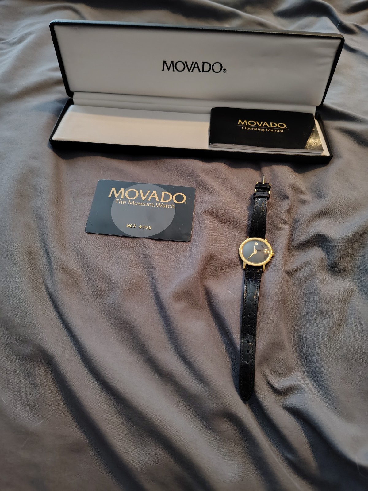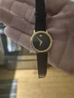 Movado Museum Classic Black and Gold Women's Watch Elevate your style with the Movado women's watch, featuring a sleek black face and luxurious gold accents. Perfect for any occasion. Vintage but works and in great condition with hardly any wear. Made in 1998