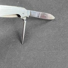 This vintage pocket knife is a versatile tool that includes a fork, tooth pick, scissors, and bottle opener. The knife features a drop point blade made of stainless steel with a plain edge and a slipjoint lock type. The handle is also made of stainless steel and is ambidextrous, making it suitable for both right and left-handed individuals. The knife has a vintage look and is an original collectible item. It is perfect for collectors or those who appreciate the functionality of a pocket knife.