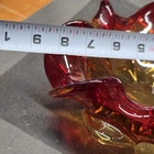This vintage Murano blown art glass bowl from the 1950s features a striking red and yellow ruffle edge design, typical of the Mid-Century Modern style. Handmade in Italy using traditional hand-blown techniques, this decorative bowl is a unique piece that adds a touch of vintage charm to any occasion. Its glossy finish and vibrant multicolor pattern make it a standout piece for collectors of art glass and retro decor. The handmade quality and production style of Murano glass combine to create a one-of-a-kind item that is sure to enhance any home's aesthetic.