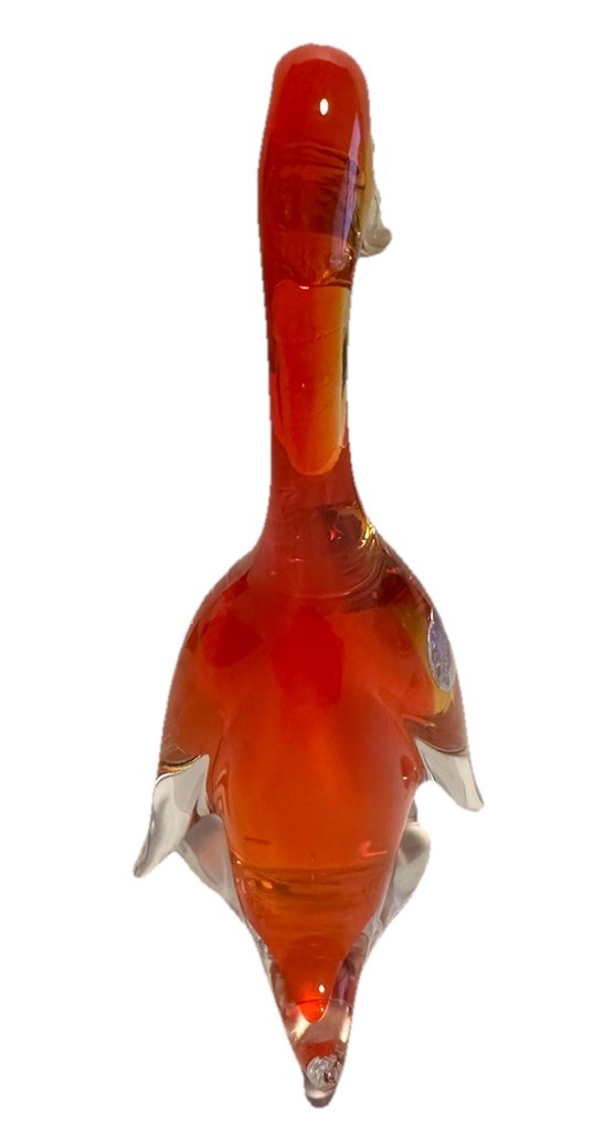 This product is a vintage Murano Italy handblown glass 6" duck figurine from the 60s/70s, showcasing the Italian craftsmanship and Mid-Century Modern style. The orange glass figurine is intricately handcrafted with a glossy finish, making it a unique and decorative piece for any collection. Originating from Europe and featuring a European brand, this handblown glass duck figurine is a charming representation of Italian artistry and a beautiful addition to any home decor. This Mirano glass art figurine is in excellent condition with no chips or cracks. There is a rough edge to the pontil mark on the bottom. The label is still intact but has moderate wear. See All Photos for details. The art glass will be packed very secure in bubble wrap and packing paper and marked fragile to prevent damage during shipment.