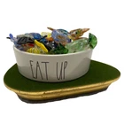 This is a vintage collection of 22 hand-blown candy pieces made of glass by Murano, Italy. The candies come in different sizes, ranging from 3 inches to 2 inches, and are multicolored, some are textured and others have a clear string for hanging. Two come with original Murano sticker. They feature carvings, a 3D effect, high gloss, translucent, and some have a textured finish. The candies are bright and have a total weight of 1 lb 10 oz. They are perfect for all occasions and are ideal for adults who love art. Set only includes 22 candies. These exquisite set of Original Murano are in overall good condition. However, two pieces have chipped corners. Some have clear strings attached for hanging. Please refer to pictures.