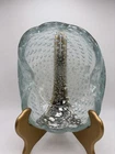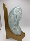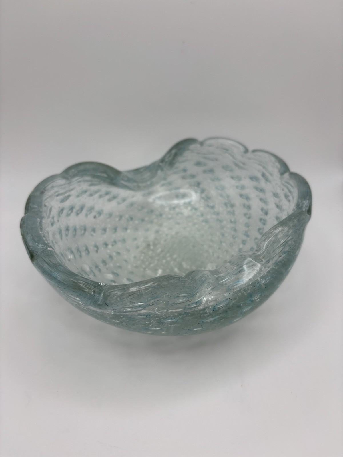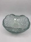 This vintage Murano art glass trinket dish bowl features a beautiful teal green color with silver flecks, adding a touch of elegance to any space. Perfect for displaying small trinkets or jewelry, this art glass bowl is a beautiful addition to any vintage-inspired decor. A5