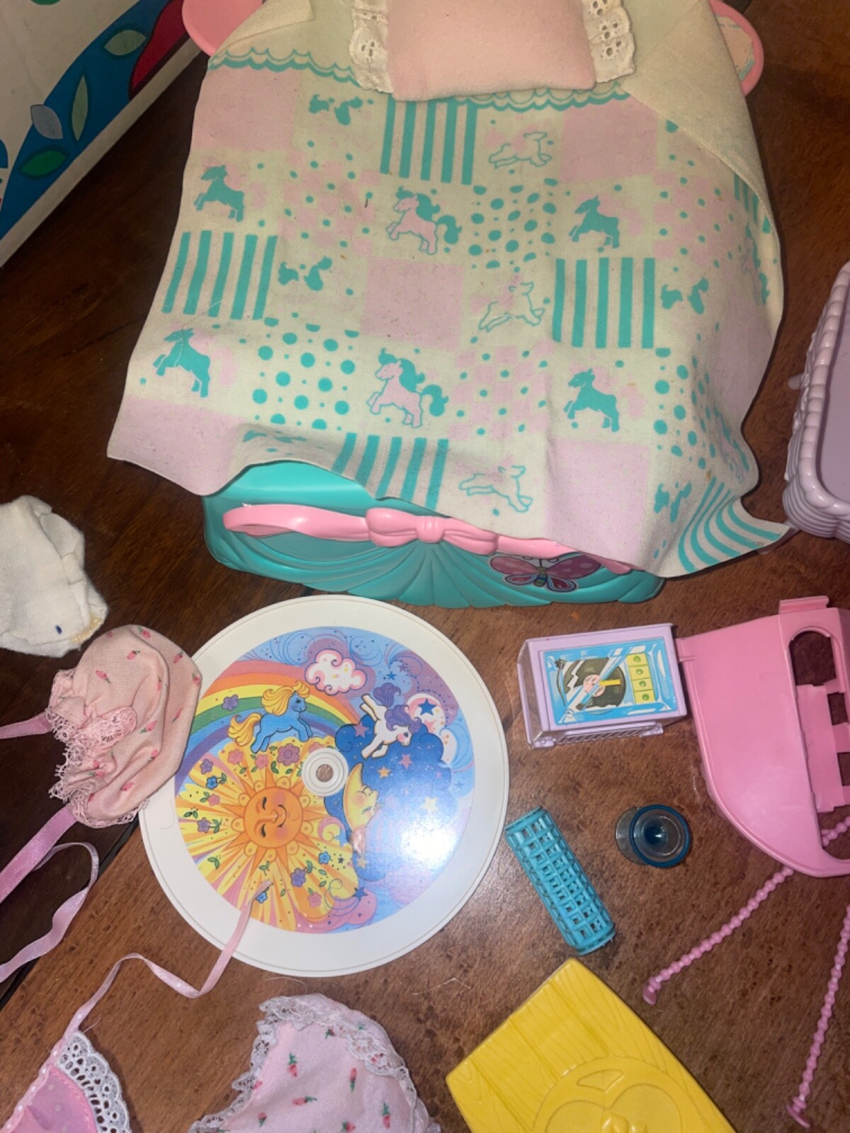 Lots of accessories for several different G1 My little pony play sets. There’s parts for the baby buggy, castle, bed, nursery, and more. Some items are in better shape than others as conditions vary. The spinning thing that goes to the bed is missing whatever attaches it to the bed. Some of the rubber hats and saddles have some condition issues, need to be cleaned, or have spots or marks. May need to clean up some of this stuff or all of it. There’s a sticker on the bed. May show other signs of use or wear but overall decent for its age. Sold as is no returns. Handling within two business days. Thank you!