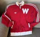 Vintage 2012 University of Wisconsin Badgers Track Jacket Men’s Size Medium, Full Zip Vintage 2012 This is an authentic old-school Wisconsin Badgers track jacket from 2012. See date on tag for proof. Overall, excellent condition with no holes or tears, but there are a few light inconspicuous stains on the white ribbing of the sleeves and bottom, and also in the red underneath the left sleeve. Probably happened at a wild football game. Please see “final four” photos for details. Lol. I have washed this item so it will arrive at your home fresh, clean, and ready to wear. 80% Cotton / 20% Polyester Front Applique: Distressed Twill W/ Whipstitch & Loose Embroidery. Women Adidas Back Neck Label. Loose Athletic Fit. Made By Adidas. Officially Licensed By The NCAA Machine Wash Cold With Like Colors, Only Non-Chlorine Bleach When Needed, Wash Inside Out, Remove Promptly After Wash, Tumble Dry Low, Cool Iron If Needed, Do Not Iron Decorations, Do Not Dry Clean