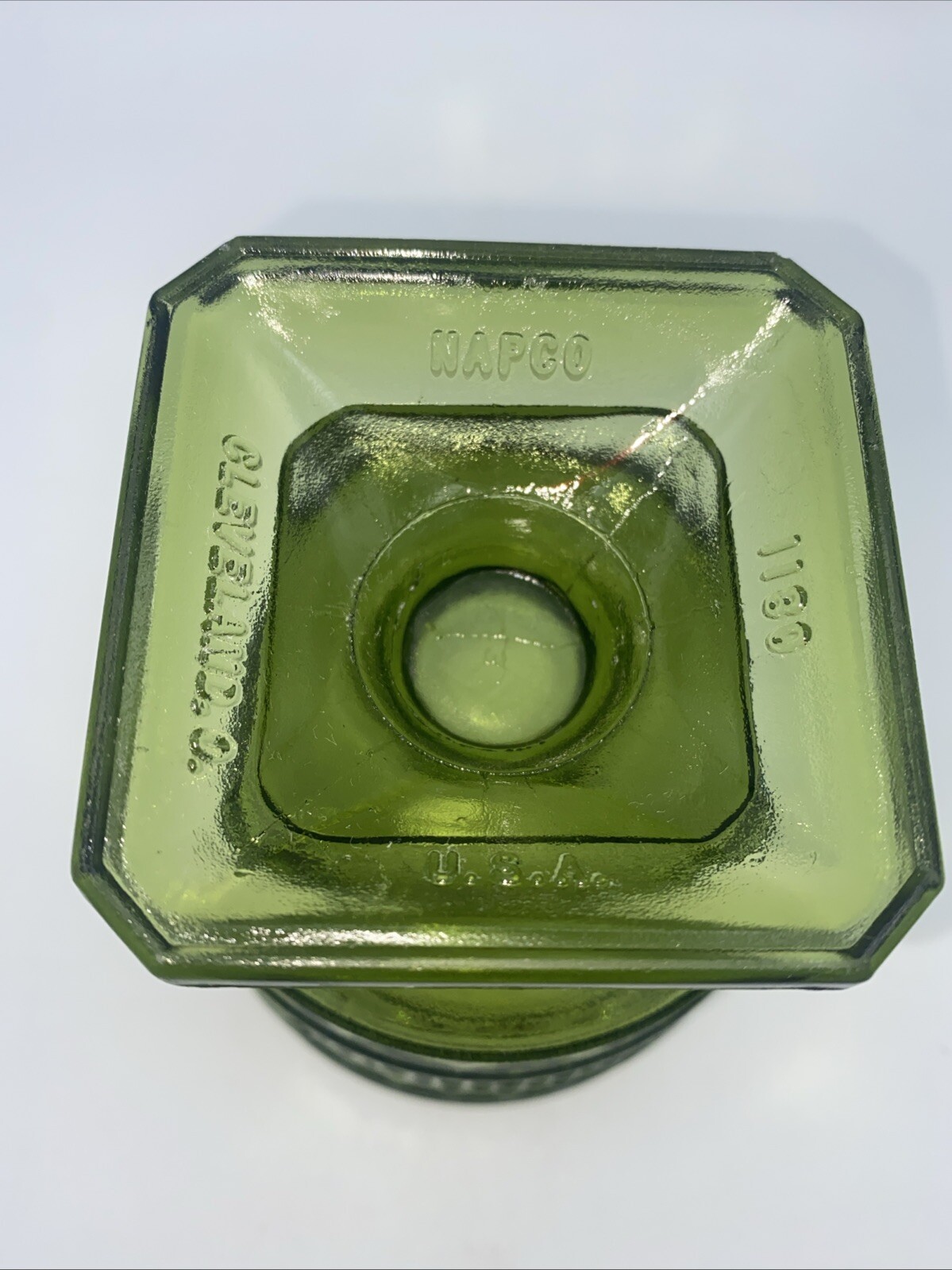 This is a vintage Napco footed planter vase from Ohio, USA. It features a hobnail pattern in green glass, round shape, and stands at 5.5 inches in height. The vase is free-standing, with a width of 4 inches. The model number is 0811, and it is part of the brand Napco. This piece would be a charming addition to any room decor.