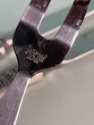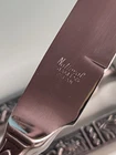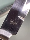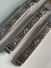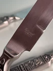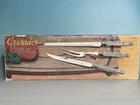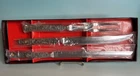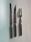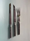 This vintage National Crusader stainless steel carving set features a castle, lion, and knight on the handles of the knife and fork. Made in Japan in the 1990s, this original set is perfect for adults who want to add a touch of medieval style to their dinner table. The silver color and intricate design make this set a great addition to any collection. The set includes a two knives and a fork, which are made of durable stainless steel. The National brand is known for its quality products, and this set is no exception. Whether you're a collector or just looking for a unique flatware set, this vintage National Crusader set is sure to impress.