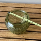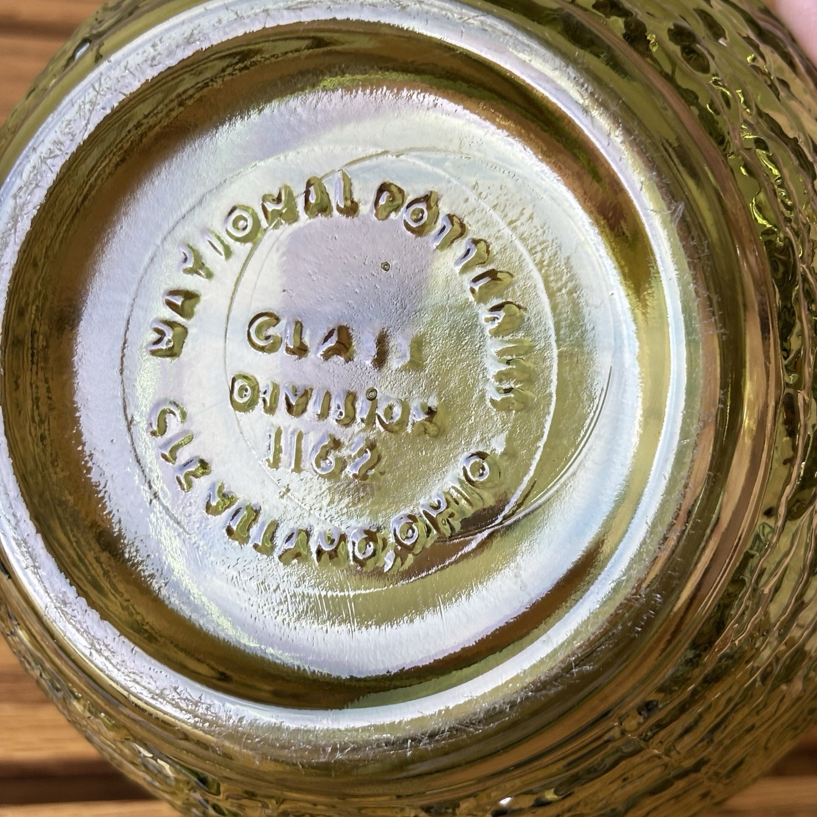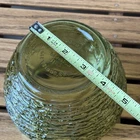 The National Potteries Cleveland Ohio Glass Division 1162 green Planter /Vase/ Humidor is vintage glass with a unique ribbed texture finish. Made in the United States, this original piece features a bee hive theme and a backstamp indicating its authenticity. Standing at 4.75" tall and 5" wide, this decorative pottery and glassware item is a stunning addition to any collection.