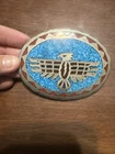 Delve into the rich heritage of Western Americana with this vintage Native American Turquoise Eagle Belt Buckle. Crafted with meticulous attention to detail, this handmade piece reflects the timeless artistry and culture of the Native American tradition. The buckle features an awe-inspiring eagle design, a symbol of freedom and strength, making it a standout accessory for any collection. Proudly manufactured in the United States, it carries the spirit of the West and the reverence for nature. This belt buckle is not just a piece of jewelry but a slice of history, a representation of the craftsmanship that has been cherished through the generations. It's an ideal pick for enthusiasts of Western Americana and those with a passion for the historical beauty of Native American culture.