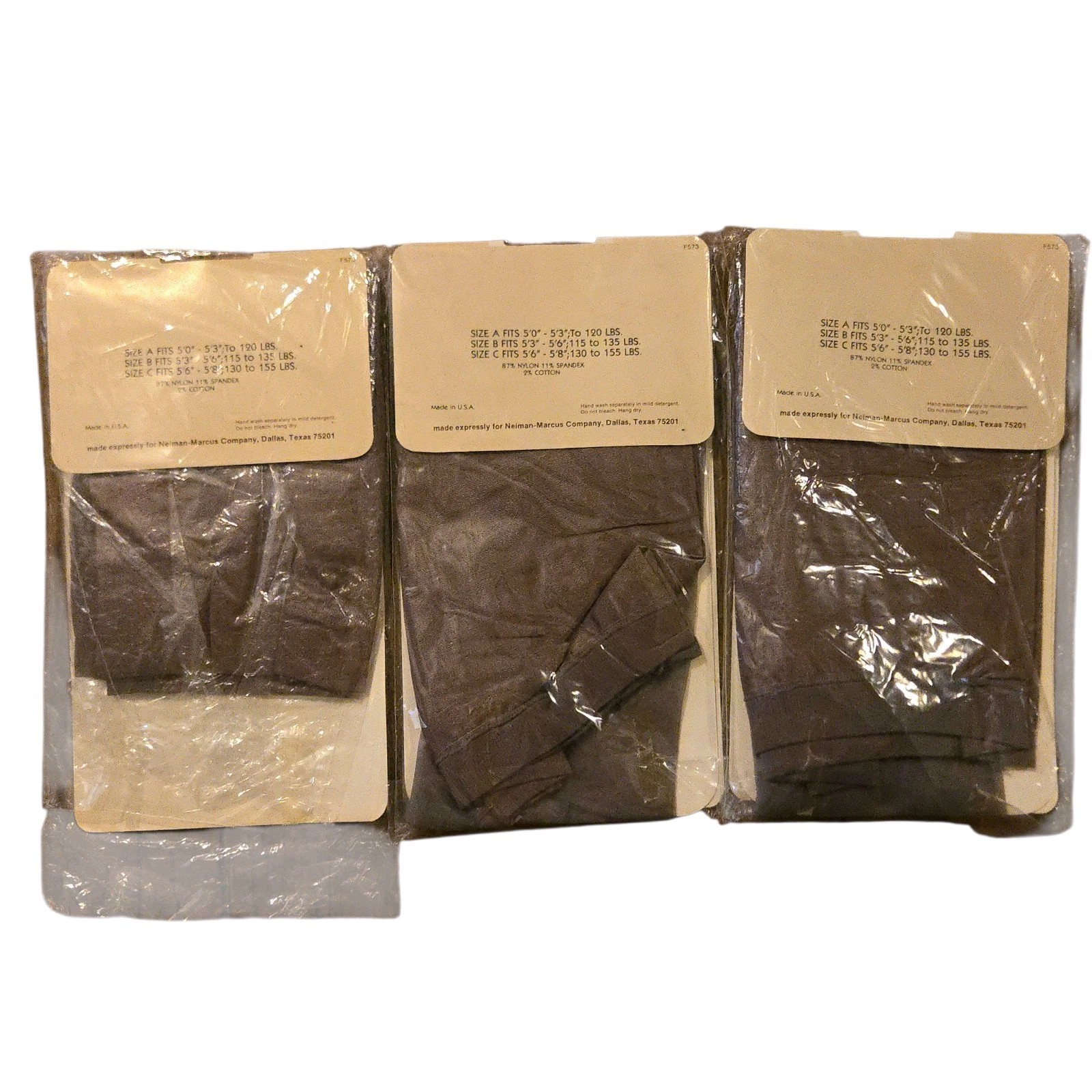 The product is a lot of three Vintage Neiman Marcus Ultra Sheer Pantyhose in Sandalfoot size B. These pantyhose are designed for women and are made of a combination of nylon and cotton. The color is brown, and they feature a control top tights style. With their ultra sheer opacity, these pantyhose are perfect for adding a touch of elegance to any outfit, especially for those who love to wear vintage fashion pieces. Style: 1470 SIZE B FITS 5'3'-5'6 115-135 LBS GUNMETAL DALLAS, TEXAS TX MADE IN USA