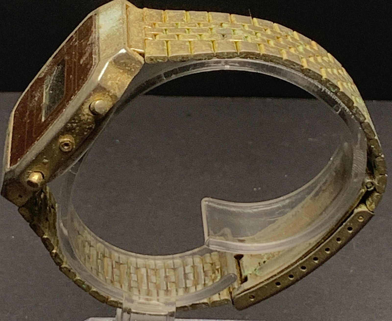 Lug Width: Unknown Closure: Buckle Handmade: No Watch Shape: Rectangle Model: Digital Watch Year Manufactured: Unknown Case Size: Unknown With Original Box/Packaging: No With Service Records: No Display: Digital Band/Strap: Bracelet With Papers: No Style: Casual Seller Warranty: No With Manual/Booklet: No Bezel Color: Gold Caseback: Solid Band Width: Unknown Customized: No Band Material: Stainless Steel Case Thickness: Unknown Handedness: Right Indices: No Hour Marks Max Wrist Size: Unknown Case Finish: Polished Case Color: Gold Band Color: Gold Theme: Classic Brand: Nelsonic Country/Region of Manufacture: Unknown Number of Jewels: No Jewels Features: Water-Resistant Type: Wristwatch Dial Color: Brown Movement: Quartz Manufacturer Warranty: 1 Month Dial Pattern: Logo Department: Men Bezel Type: Fixed Case Material: Stainless Steel Water Resistance: Unknown Vintage: Yes