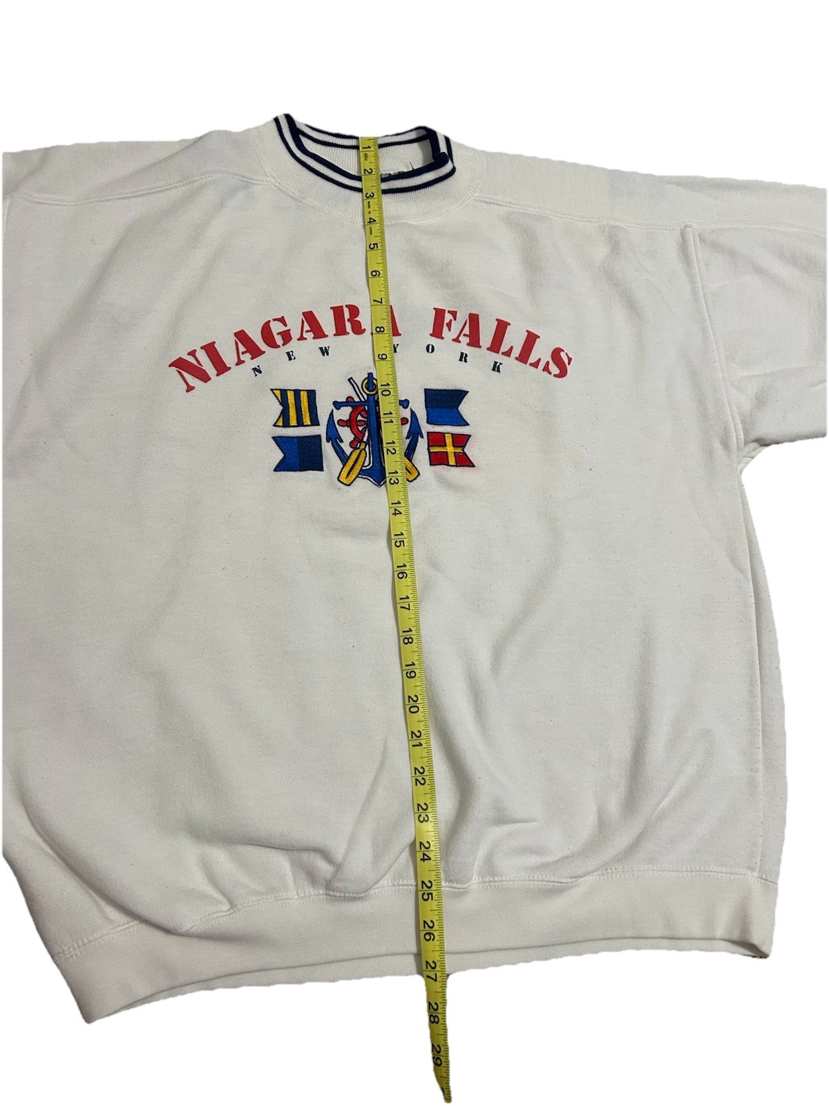 The Vintage Niagara Falls Canada Crewneck Sweatshirt is a rare find from the 80s or 90s, featuring a solid white color and a crew neckline with short sleeves. Made from cotton, this XL adult pull-over sweatshirt is machine washable and has a regular fit. The garment is adorned with a graphic print showcasing Niagara Falls, Canada, giving it a unique vintage appeal. Perfect for men who appreciate retro styles, this sweatshirt is a nostalgic addition to any fall wardrobe.