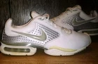 This Vintage Nike Air Max Sneakers in men's size 8 feature a classic white and silver colorway with a low-top design. Manufactured in 2004, these Y2K sneakers are part of the Nike Air Max line and offer a comfortable fit with cushioning and orthopedic support. The lace-up and pull-on closure, along with the lightweight and breathable construction, make them suitable for casual or activewear use during various seasons. Perfect for retro or sports-themed outfits, these sneakers also boast a non-slip rubber outsole for added performance.