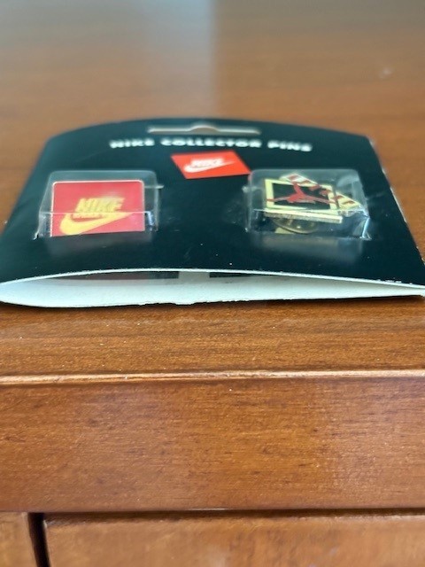 Vintage Nike Collector Pins Set – Swoosh Logo & Air Jordan Jumpman – Sealed Harder to find sealed on original retail card. Most examples are loose pins. Offered here is a vintage Nike Collector Pins set featuring the classic Nike Swoosh logo and the iconic Air Jordan Jumpman logo , still sealed on the original retail display card. These enamel pins were produced by Nike as collectible accessories designed for jackets, caps, or bags and were sold through sporting goods retailers in the 1990s era. The set remains factory sealed in the original clamshell packaging , making it especially appealing to Nike and Air Jordan collectors. The card also retains the original retail price sticker from Good Sports ($8.00) , which adds authenticity and vintage retail history to the piece. Item Details Brand: Nike Style number: 576012-001 Pins included: Nike Swoosh logo pin Air Jordan Jumpman logo pin Material: Cloisonné enamel Packaging: Original sealed clamshell on display card Made in Taiwan Packaging printed in Taiwan Condition New old stock / sealed Pins have never been removed from the packaging Card shows minor storage wear consistent with age Plastic clamshell intact Please review photos for the exact item you will receive Why Collectors Like These Classic Nike + Jordan branding Vintage retail packaging Harder to find sealed on original card Great addition to Nike, Air Jordan, sneaker, or sports memorabilia collections Shipping Carefully packed to protect the card and clamshell Ships within 1 business day Tracking included Seller Notes From a long-time collection of vintage sports memorabilia. Guaranteed authentic Nike merchandise. Keywords: Nike pin, Air Jordan pin, Jumpman pin, Nike swoosh pin, vintage Nike collectibles, sneaker memorabilia.