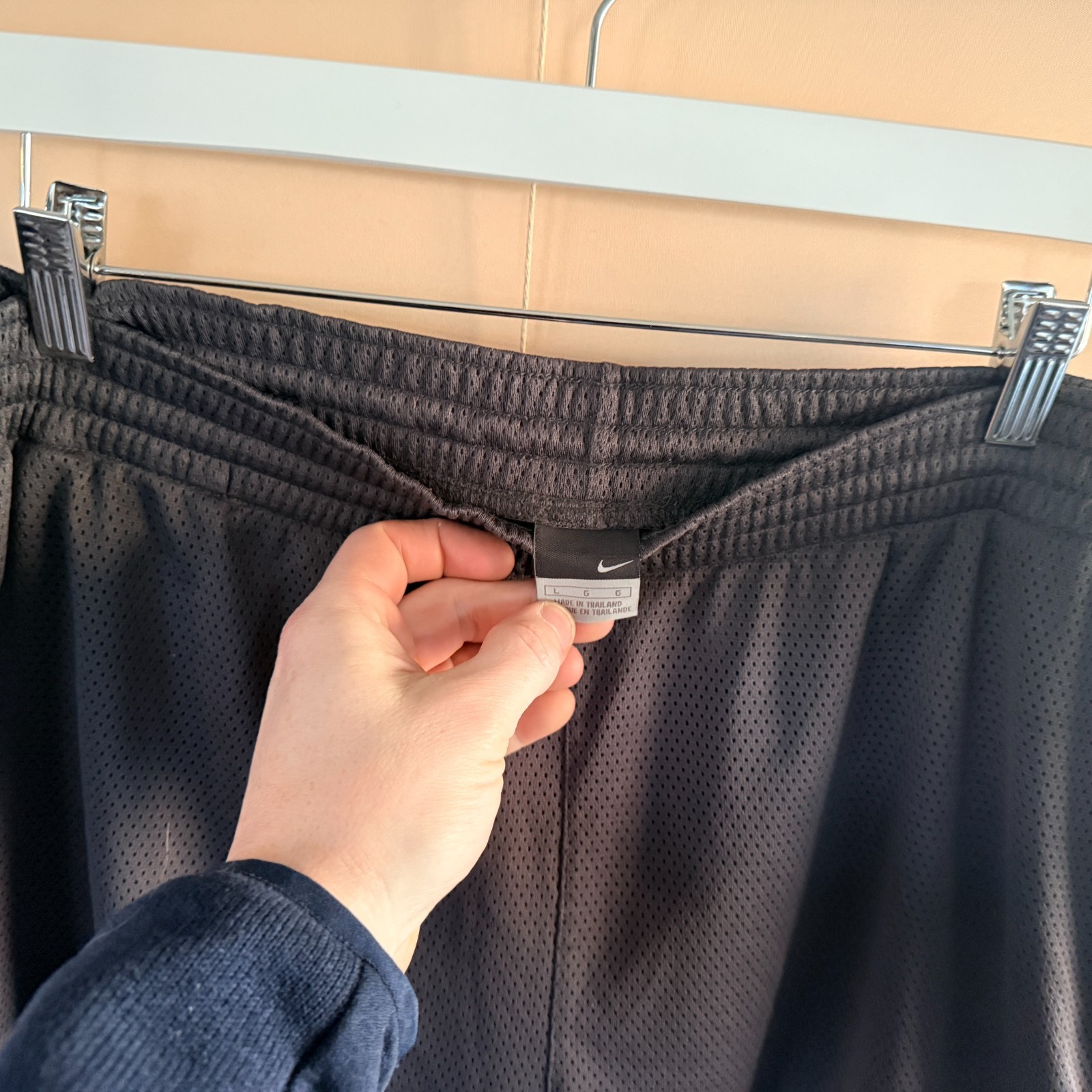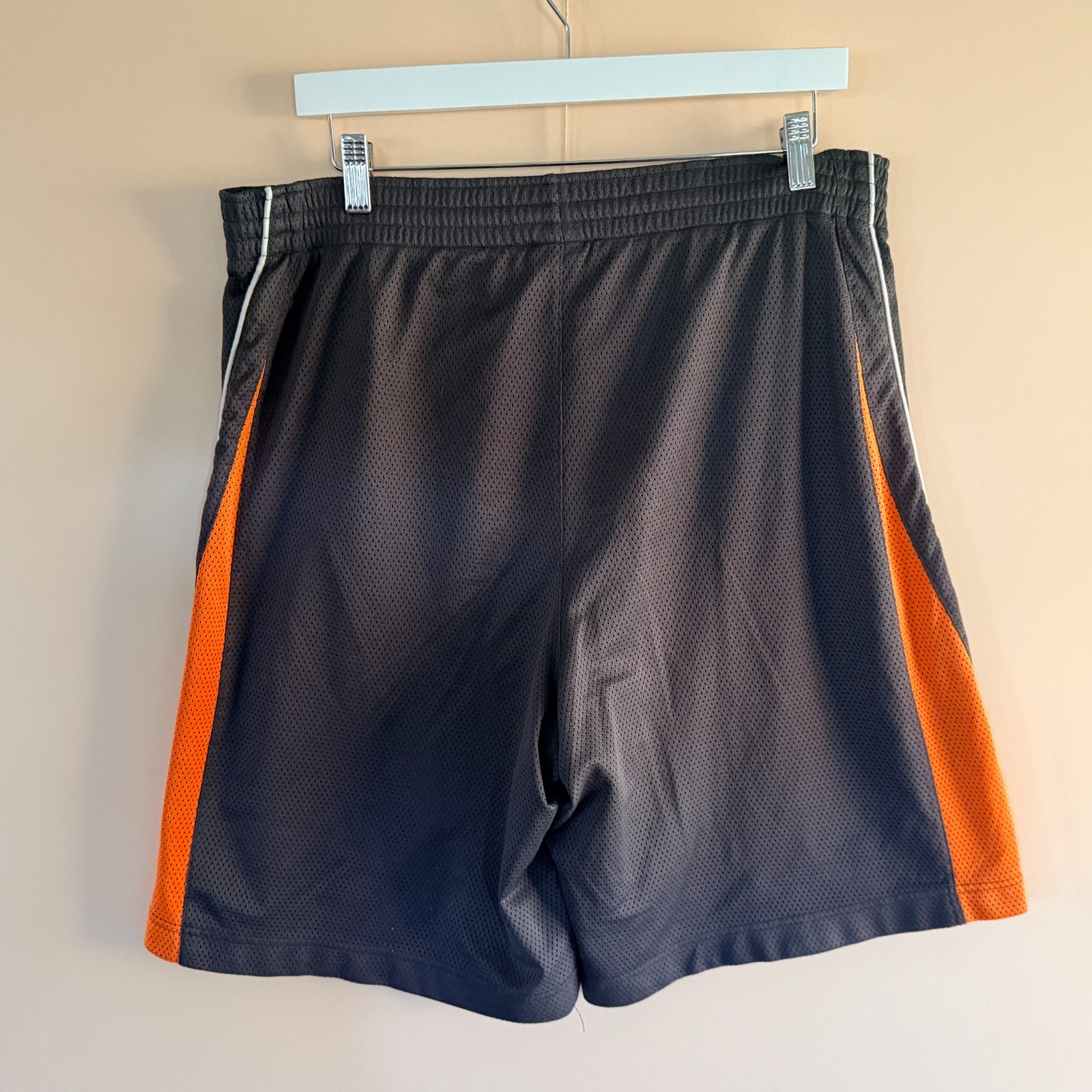 The product is a vintage pair of Nike mesh basketball shorts in gray with orange accents, designed for men in size Large. These athletic shorts feature a drawstring closure, 100% polyester material, and a regular fit. Perfect for activewear, they are machine washable and ideal for basketball performance during the summer, fall, and spring seasons. The vintage Nike brand adds a classic touch to these comfortable and stylish shorts.