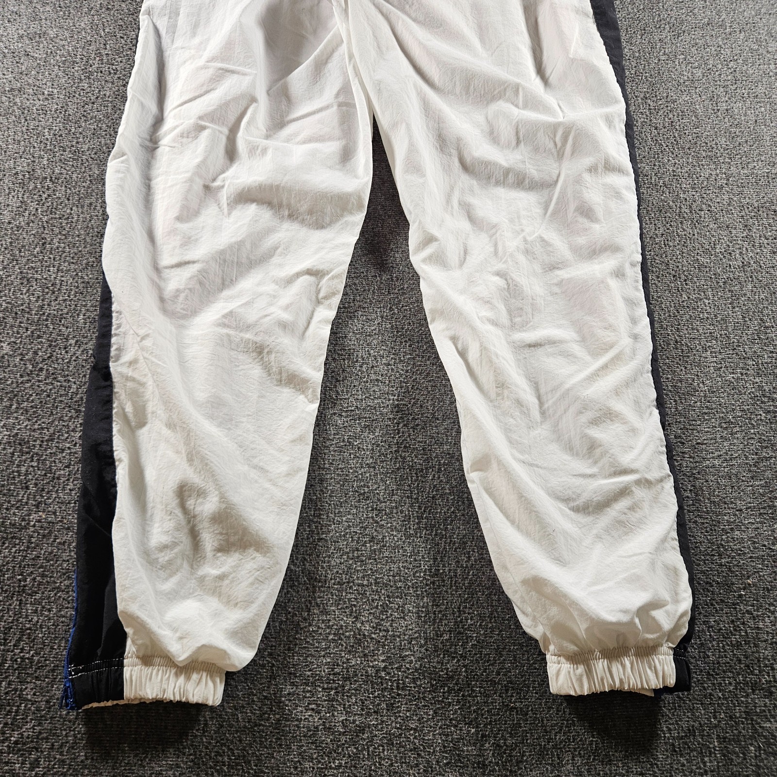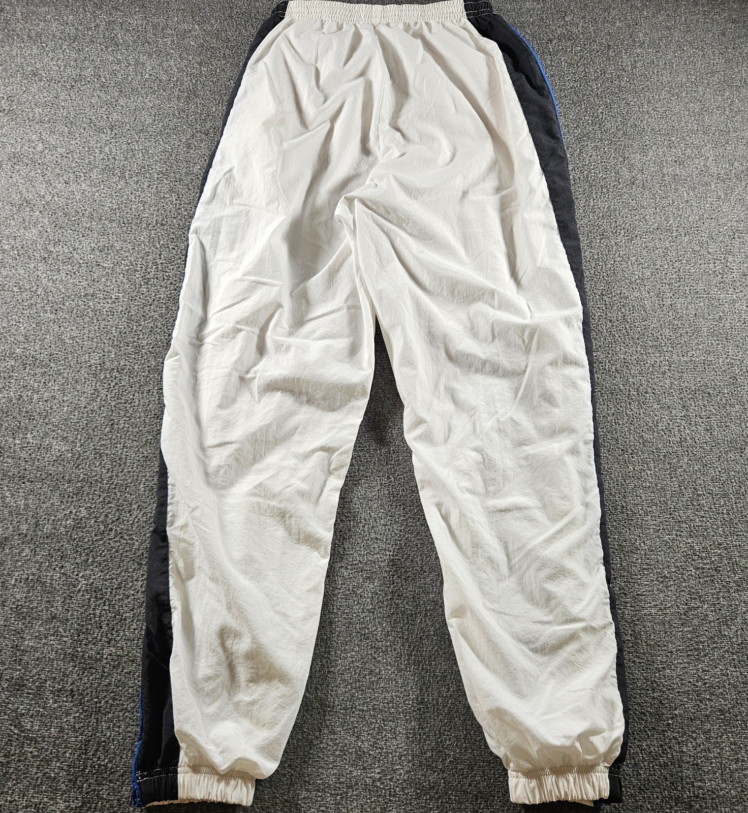 These Vintage Nike Track Pants in white and blue are a nostalgic throwback to the 90s, perfect for a youth size large boy looking for a statement piece of activewear. Made of nylon material, these pants feature an elastic waist for comfort and are machine washable for easy care. The solid pattern and Nike branding add a touch of retro style to the wardrobe, ideal for the winter, fall, or spring seasons. Made in Taiwan, these track pants are a unique and stylish addition to any young boy's clothing collection.