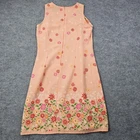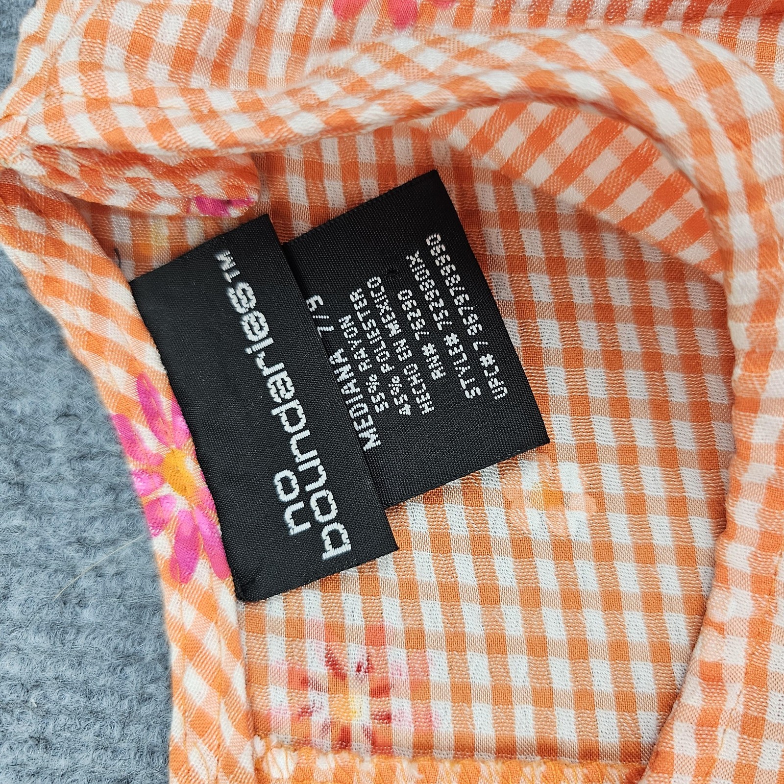 Brand: No Boundaries Item: Sleeveless dress with gingham check and floral embroidery Color/Pattern: Orange and white gingham with multicolor floral; floral border at hem and scattered florals throughout Gender/Size: Womens, Juniors size 9 (tag) Material: 55% Polyester, 45% Rayon (per tag) Country of Origin: Made in Mexico (per tag) Style/Design: A-line/shift silhouette; scoop neckline; knee-length appearance Brand Markings: "no boundaries™" woven label inside neckline Photos include close-ups of labels and seams; rulers shown for reference only—please compare to a similar garment for best fit. Notes: Unlined; classic casual/summer look with embroidered floral border and scattered flower details.