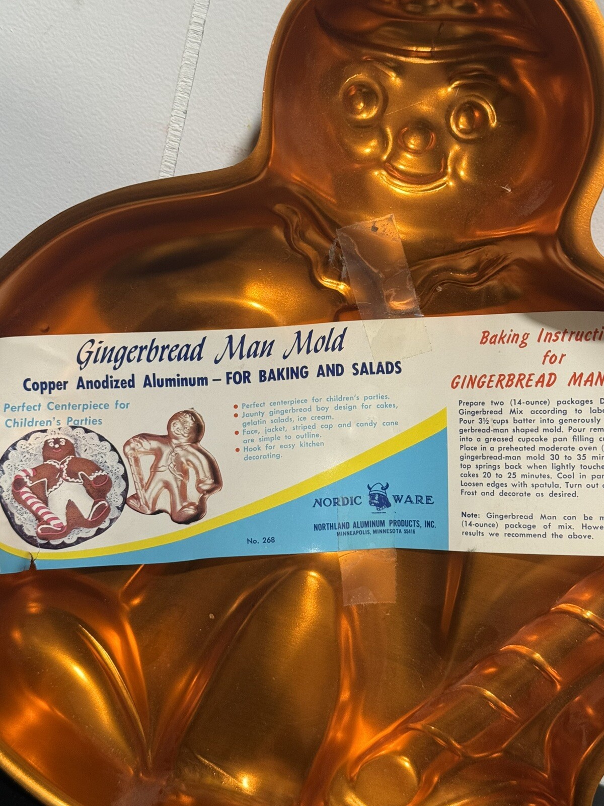 The product is a vintage Nordic Ware cake pan in the shape of a gingerbread man, made of aluminum. It is copper anodized and comes with a cookbook. The cake pan measures 11 inches and is a collectible item under the categories of Cookie Cutters, Baking Accessories & Cake Decorating, and Kitchen & Home.