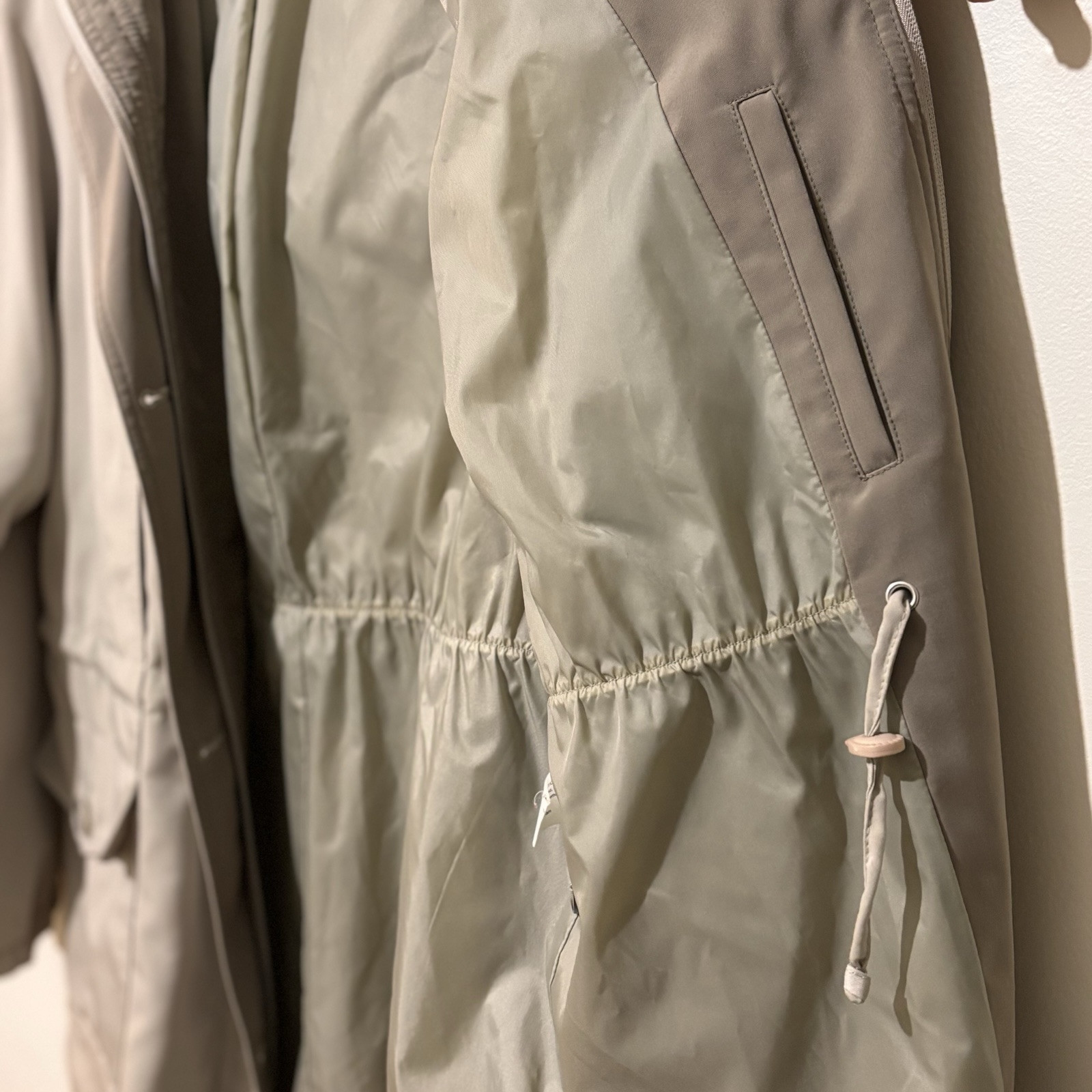 Vintage Gallery brand raincoat from Nordstrom in a beige tan taupe color. Lined, water resistant, removable hood, cinch waist. Chore coat style, hits at mid-thigh. Excellent used condition, no rips, stains, or flaws. All buttons and zippers intact and in working condition. Measurements: Chest (pit to pit) 24” , length 30”, sleeve 23” Next day shipping, great packaging, open to offers!