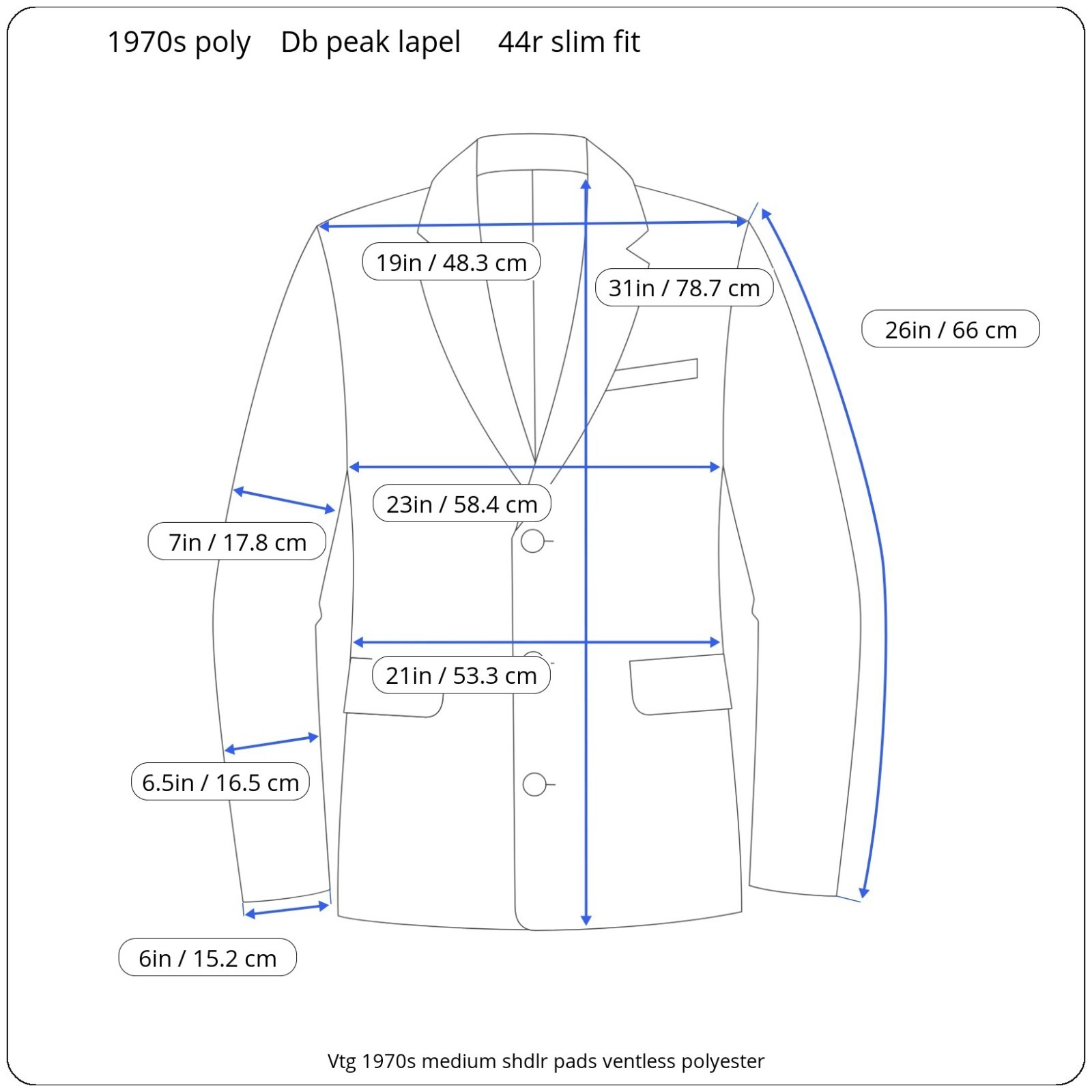 Size: 44R USA slim fit with 26-inch arm length and a jacket length of 31 inches. Pants: 37xunfinshed at 36 inches For complete measurements, see photos #2 and #3 Color: light brown To see exactly how we measured, see the last series of photos. Extra fabric for adjustments: Waist: 2 inches Inseam: unfinshed at 36 inches Arms: 1 inch Condition: excellent vintage condition. Tags still attached and unfinshed inseam. Slight smell of smoke. Vintage 1970s, medium shoulder pads ventless, polyester, drop 7 Return policy: We offer free shipping and no returns. We can not afford to offer both in the highest return category on eBay. It becomes very expensive to mail out items for free for people to try on if they are not confident in checking the measurements in picture #2. If you prefer to have the ability to return the item and pay $12.95 shipping, please send us a message, and we can change the listing format to offer returns. The $12.95 shipping cost would break us out even in the case you needed to return the item. We ship the next business day after the payment is made.