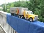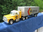 This vintage semi and trailer is 27 3/4" length X 7 3/4" trailer height X 5 3/4" width. The truck is in good condition condition with scratches, paint chip, and scuffs. There is a piece broken off the horn ( back part ) above the driver's side cab and the running light lens on the top of cab at the passenger side is broken off. The front bumper is cracked at the left side. The trailer has a small ding at the front area just in back of sleeper and the right side trailer wheel covers are missing or broken off. There is a small amount of light surface rust on the underside of the semi and trailer. The yellow and black areas are pressed steel on the semi, except for all tires are plastic. The trailer's gray and black areas are pressed steel and the tail gate is plastic. All the axles are steel. See photo's