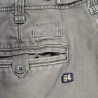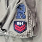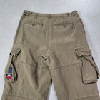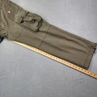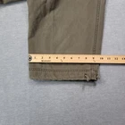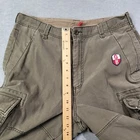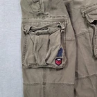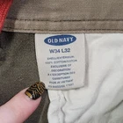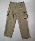 Vintage Old Navy Cargo Pants for men in size 34x32. These military green pants feature embroidered patches, a relaxed fit, and a high-rise waist. Made of cotton with a solid pattern, they have a zip closure and adjustable waist. The pants have a flat front, straight leg style, and ankle ties, giving them a unique army, rock, Y2K, grunge, 90s, and military theme.