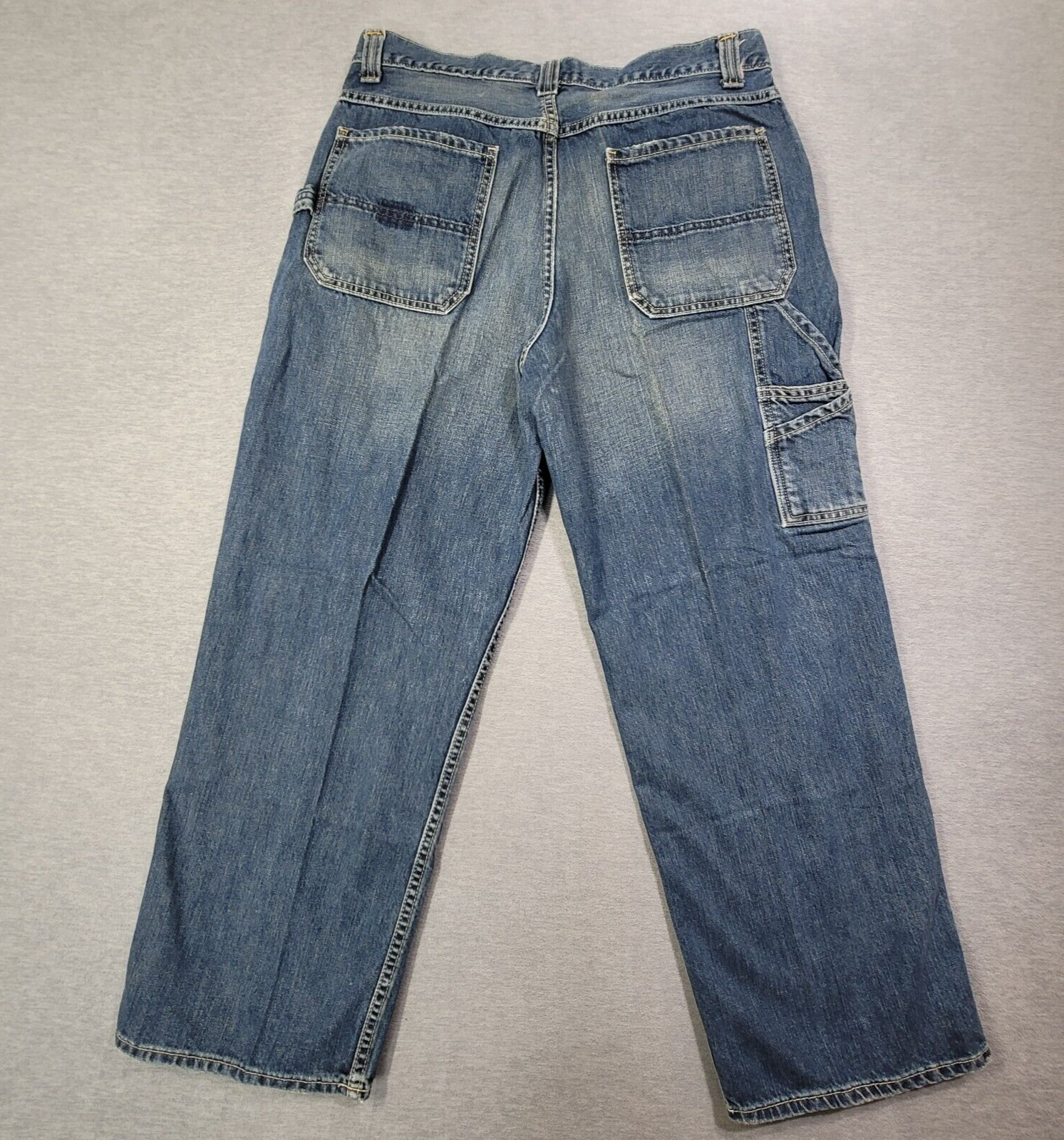 The product is a pair of Old Navy Carpenter Jeans for men in size 34 waist and 29 inseam. They are a relaxed fit with a straight leg style, made of blue faded denim material. The jeans feature a zip closure, mid-rise waist, and are designed with a solid pattern suitable for work or casual wear. The fabric wash is medium, and the brand is Old Navy, known for its quality and comfort in men's clothing.