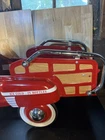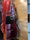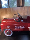 This is a vintage and original Coca-Cola pedal car, perfect for collectors and fans of soda memorabilia. The car features a colorful multi-color design with the iconic Coca-Cola logo and is in great working order. It is a child size metal toy that will bring back fond memories for those who grew up playing with it. The brand is Coca-Cola and the type of advertising is a sticker, making it a great addition to any collection. This item is a must-have for anyone who loves soda and vintage toys. Some of the wood panel sticks are starting to peel off.