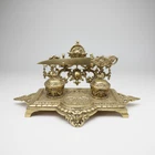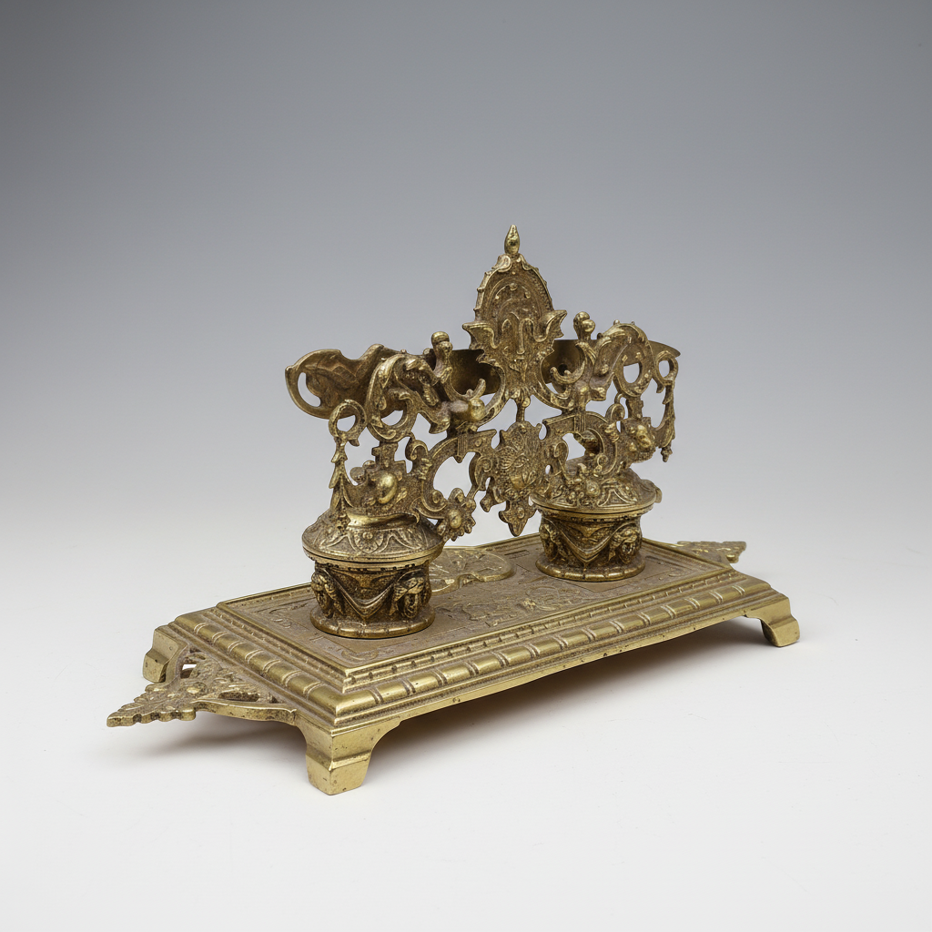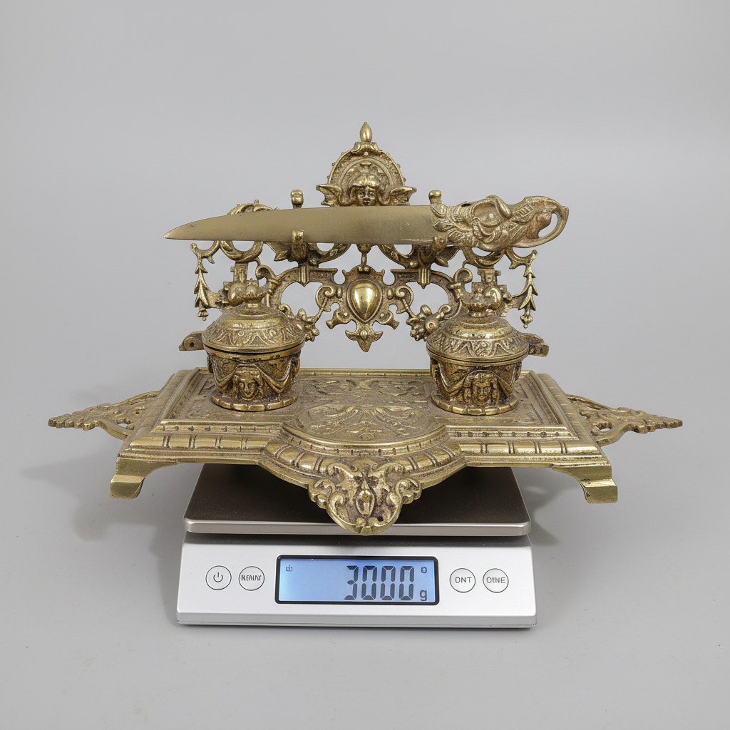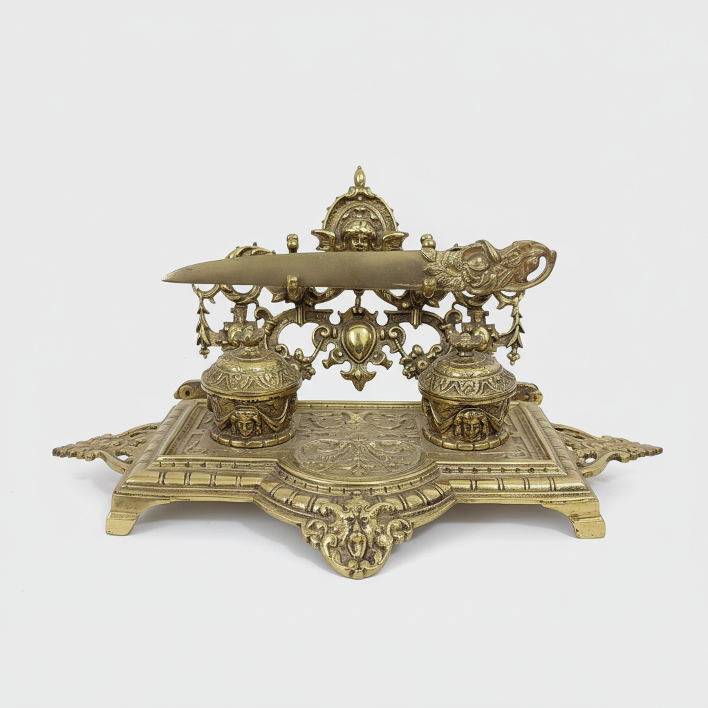 Vintage Ornate Brass Desk Set Inkwell Letter Opener Victorian Style Executive Office Decor Brass Inkwell Desk Set in Brass — Ornate Victorian Design | Vintage Condition Discover the beauty of this Vintage Ornate Brass Inkwell Desk Set , crafted from solid brass with exceptional craftsmanship and refined design. This elegant piece features intricate scrollwork , two functional inkwells , and a decorative letter opener with a figural handle , making it perfect for enhancing any executive office, home study, or vintage decor collection . Combining timeless charm with an authentic antique aesthetic , it adds a sophisticated and distinguished touch to any desk. Key Features: Made from high-quality solid brass for lasting appeal and durability. Functional and decorative — ideal for display or light use in a distinguished setting. Refined, ornate Victorian-style design with attention to every intricate detail. Perfect gift for collectors , history enthusiasts, or anyone appreciating unique desk accessories. Elegant and substantial , complementing both classic and eclectic decor themes. Specifications: Material: Brass Karat / Hallmark: Not applicable Weight: Not specified Dimensions / Size: Not specified Origin: Not specified Condition: Vintage