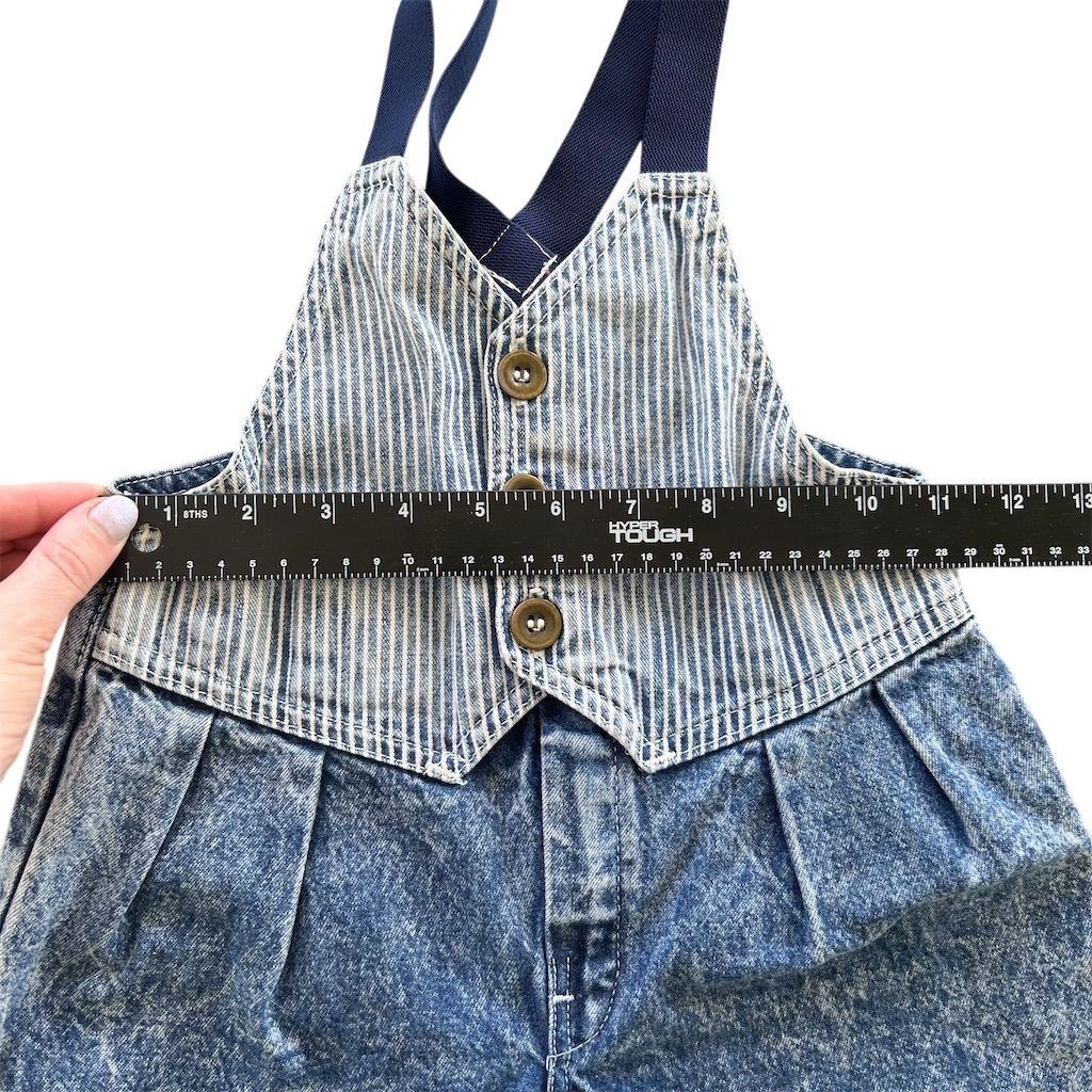 The product is a pair of vintage OshKosh B'Gosh striped overalls in size 2T, made from 100% cotton. These unisex toddler pants feature adjustable straps, a button-down front, and a cargo style design, perfect for both boys and girls. With a classic multicolor striped pattern, these overalls are a stylish and comfortable choice for any toddler's wardrobe. Made in the United States, these retro overalls offer a touch of nostalgia with a modern twist.