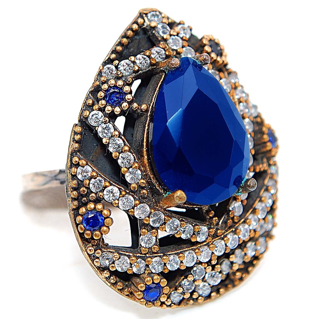 Vintage: No Main Stone: Sapphire Style: Cocktail Total Carat Weight: 4 Theme: Fashion & Costumes Diamond Color Grade: Not Applicable Base Metal: Sterling Silver, 925 parts per 1000 Setting Style: Prong Main Stone Treatment: Treated Gemstone Handmade: Yes Certification: Not Applicable Metal: Silver Type: Ring Country/Region of Manufacture: Thailand Cut Grade: Excellent Band Width: Not Applicable Brand: Handmade Country of Origin: Thailand Features: Nickel-Free Main Stone Shape: Pear Material: Gemstone Secondary Stone: Topaz Antique: No Main Stone Color: Blue Color: White Gemstone Clarity Grade: Eye Clean Diamond Clarity Grade: Not Applicable Ring Size: 8 Colored Diamond Intensity: Not Applicable Metal Purity: 925 Occasion: Anniversary/Engagement/Birthday/Confirmation/Communion