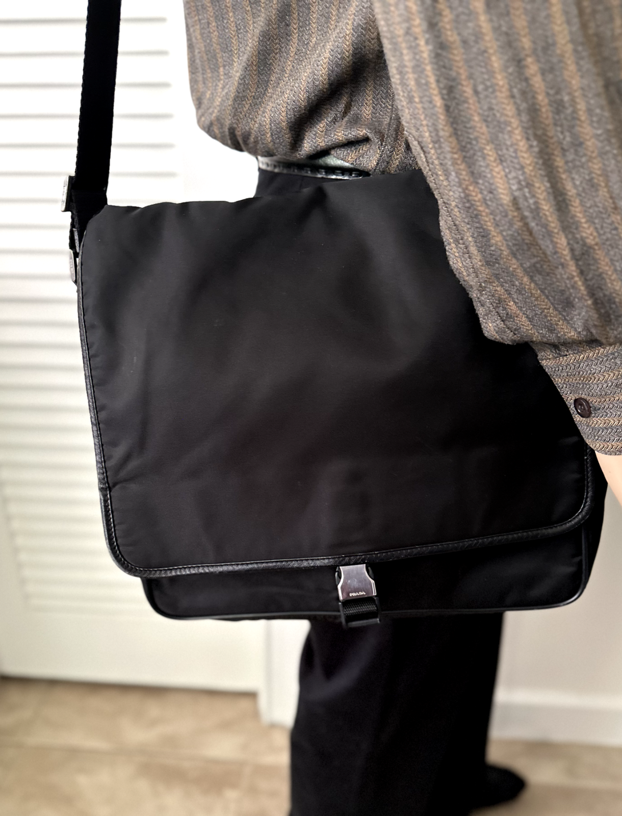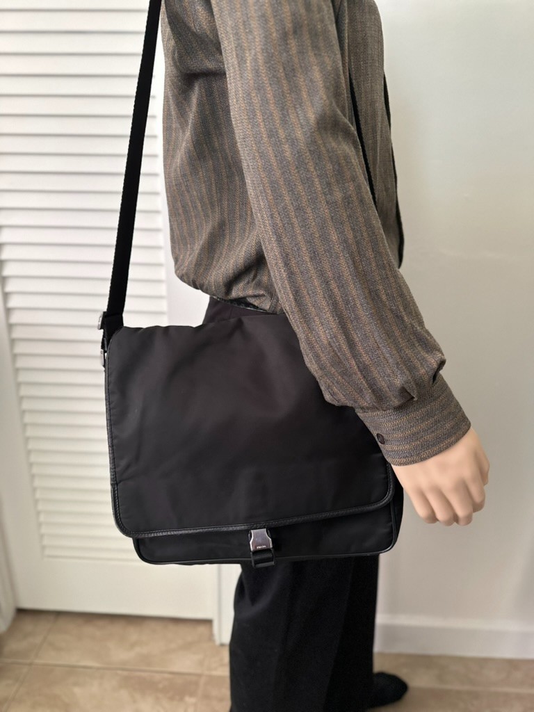 Vintage Prada Black Tessuto Nylon Medium Messenger Bag. V166 Made in Italy. Very good Pre-owned cherished condition. Some signs of normal wear to exterior, hardware and leather trim (scuffing) Please see pics. Inside is in great condition. No rips or stains. Working zippers. This vintage piece was purchase in Harrods, London. It still has many good years ahead. Measures approx: 12"L,12"H, 5"D. Adjustable nylon shoulder strap extends 44"l max One large outside back zippered pocket. Front flap and side release buckle closure. Fully lined jacquard fabric. Two inside zippered pockets, roomy Main compartment and one open doc holder. Outside metal logo. Comes with Authenticity card and Prada dust bag.