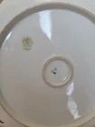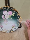 This vintage porcelain cake plate from Royal Bayreuth is a stunning addition to any collection. The 10" round plate features a beautiful floral pattern of wild roses and daisies with a green and gold finish. The plate is hand-painted and handmade, with a stamped backstamp for authenticity. Crafted in Bavaria, Germany during the 1930s, this original American Empire style plate is a true vintage piece. It is perfect for all occasions and can be used as a decorative plate or as a serving platter. Care instructions are included for hand washing only. This plate is a must-have for any collector or lover of porcelain art.