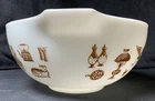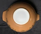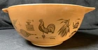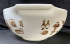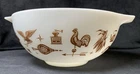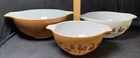 This Vintage Pyrex Early American Cinderella Mixing Bowl Set includes three bowls: 444, 443, and 442. Which are the 4 quart, 2 1/2 quart and 1 1/2 quart bowls. The bowls are made of milk glass with brown designs and have a vintage pattern. They were produced in the United States during the 1960s using pressed glass and fused glass techniques. The bowls are original and have a production style that is consistent with the time period manufactured. The set is perfect for all occasions and includes three pieces. The bowls are in excellent condition and are an original licensed reproduction. The set is not handmade and does not have any antique value. Used Some wearing and scratches Please see pictures for details