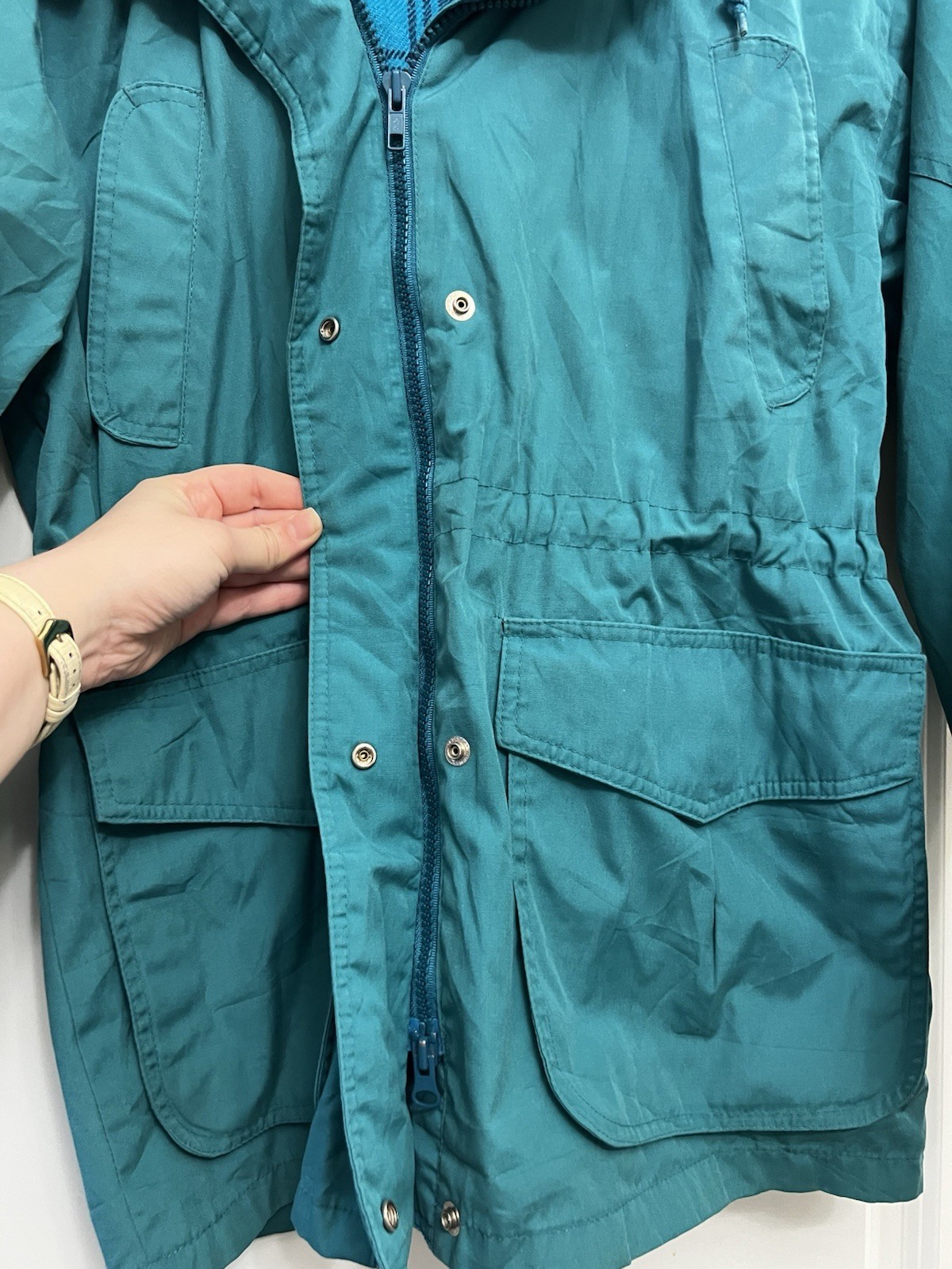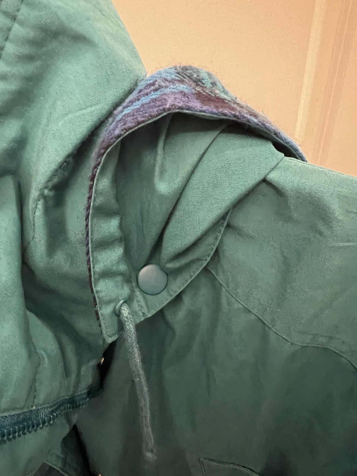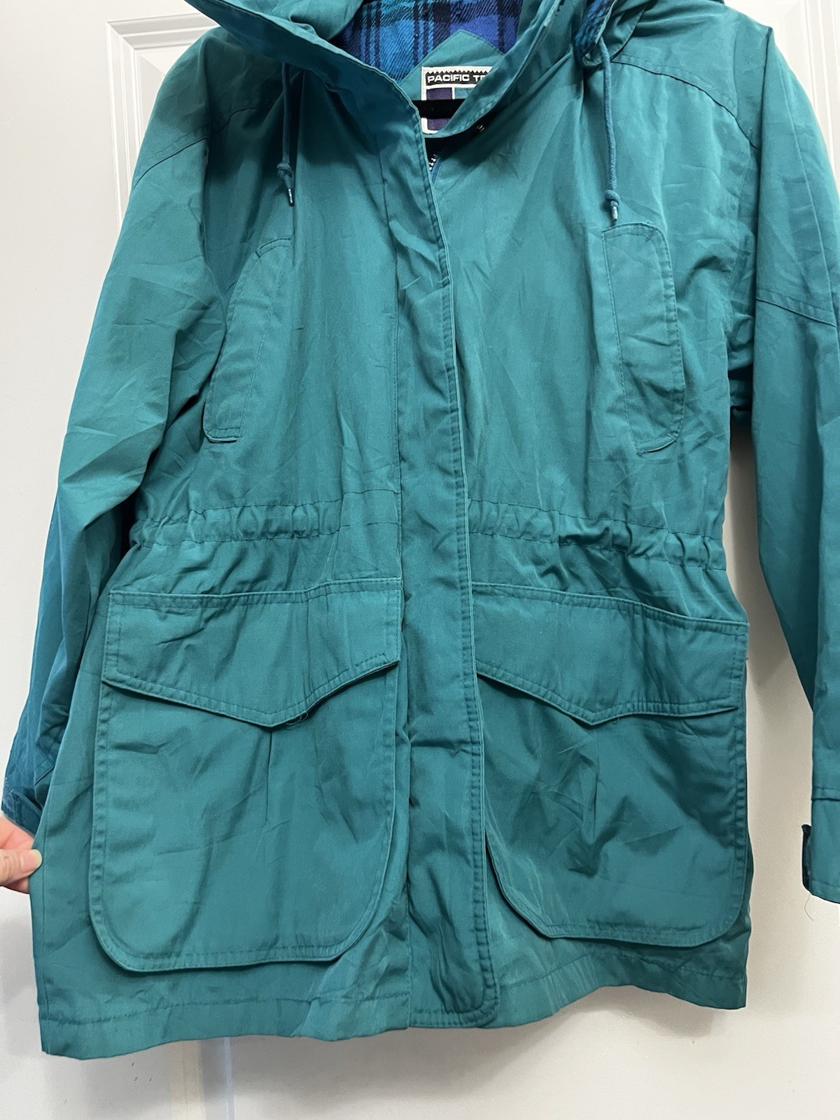 Step into the retro outdoor trend with this vintage Pacific Trail hooded parka, a true 80s/90s classic. Made in Korea and fully lined in warm blue plaid fleece, this coat nails the gorpcore, retro hiking, and vintage mountain-wear aesthetic that is so in right now. The teal nylon shell is wind-resistant and durable, and the hood is fully removable with snap attachments — perfect for changing weather or switching up your look. Multiple pockets (including oversized utility pockets) make it functional for everyday wear, travel, and outdoor adventures. The zip + snap front and adjustable waist add that iconic vintage expedition vibe. Features • Women’s size S • Vintage 80s/90s Pacific Trail • Teal nylon shell • Blue plaid fleece lining • Removable hood (snap-off) • Zip + snap closure • Multiple pockets, including large front utility pockets • Adjustable drawstring waist • Wind-resistant • Made in Korea