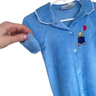 This product is a vintage Paddington Bear newborn blue footed sleeper pajamas, perfect for a retro kidcore Y2K style. The one-piece bodysuit features a snap closure for easy dressing, making it ideal for casual occasions. Machine washable and in size newborn, this adorable piece is designed with a charming bear theme that is sure to delight both parents and little ones alike.