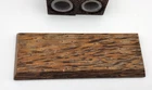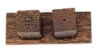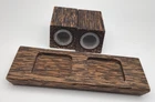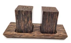 This beautiful set of Palm Wood salt and pepper shakers with tray measures 5.5" in length and 2" in width (the tray itself) while the shakers themselves measure 2" in height and 1.25" in width. They do have their plastic stoppers. Shipped with USPS Ground Mail. Bp