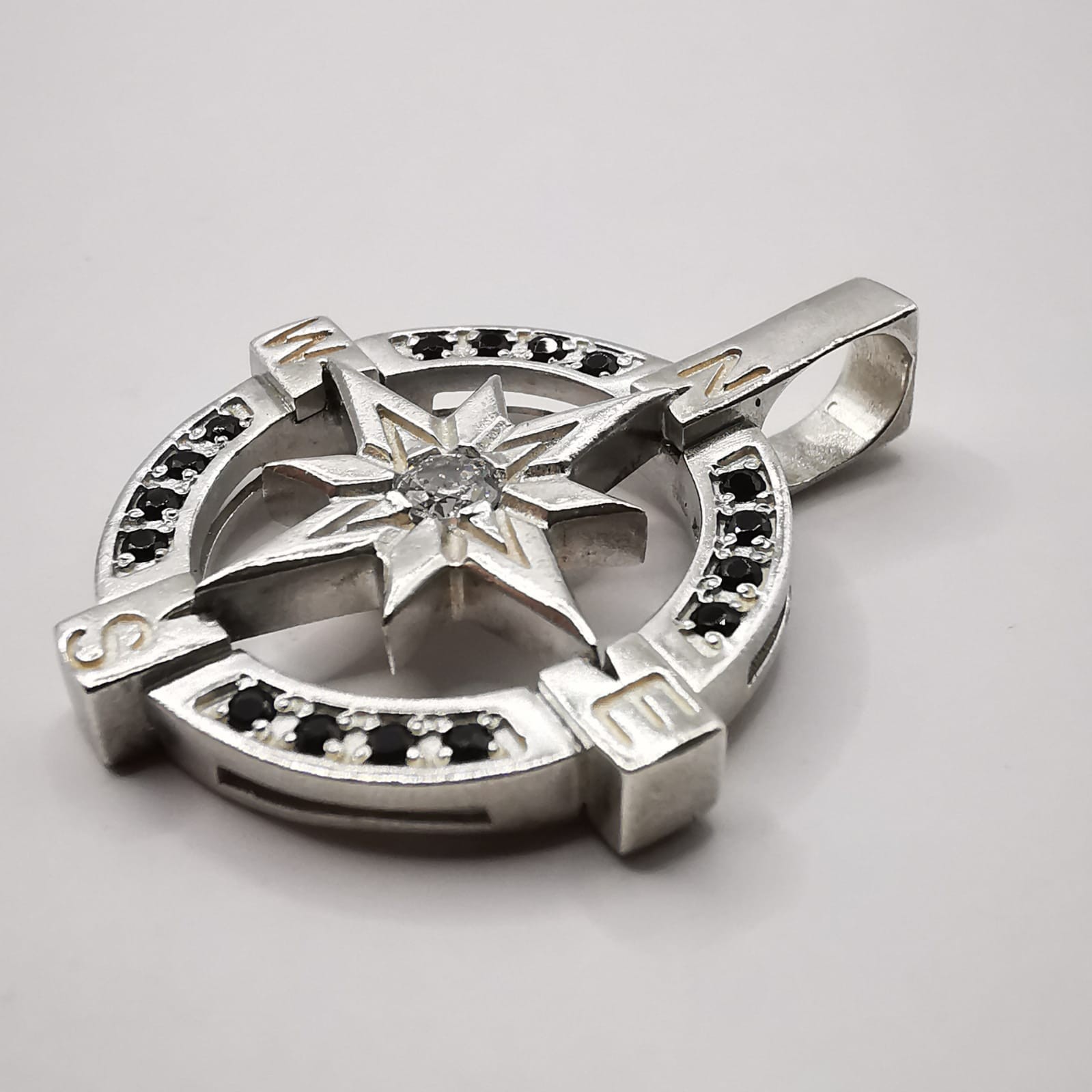 WELCOME Vintage Pendant Wind Compass Rose 925 Sterling Silver Created Zircon Spinel Stones Handmade Description: Metal / 925 Sterling Silver Length Width: 2,5 / 2,5 cm = 0.98 / 0.98 in Weight : 5.47g Stones: Zircon, Spinel. In very good condition, as shown in the photos. "Compass Rose" Pendant a classic symbol used in ancient maps to mark the four directions: North, East (E), South (S), and West (W). Encrusted with black stones and handcrafted, it also exudes an artistic and personal touch, as if it were a unique piece that expresses the wearer's personality. This is truly a masterpiece of presto for the collection. If you find yourself attracted to it, I highly recommend that you buy it now. This is a lovely item to own or to give as a special gift. Please review all photos closely, since they are a large part of my item description (all made with daylight, to show the color as authentic as possible). Shipping I do worldwide shipping by Registered mail with a tracking number. Shipping takes up to 21 business days All additional payments such as tax, are the buyer’s responsibility. Return policy I checked each product and I sell only the best quality ones. In any case, if you are not satisfied with the product please get in touch with me and I will do everything for your satisfaction. You have a 100% guarantee and refund; it is only accepted within 14 days in its original packaging and the condition of the item you bought must remain the same. Buyers pay for shipping and all additional payments such as tax. Feedback: I give immediate positive feedback to buyers as soon as the payment is received for the purchase. In any case, if there is a problem contact me right away before leaving feedback. I will do my very best to resolve any problem that occurs and satisfy you . Thank you for shopping 😊