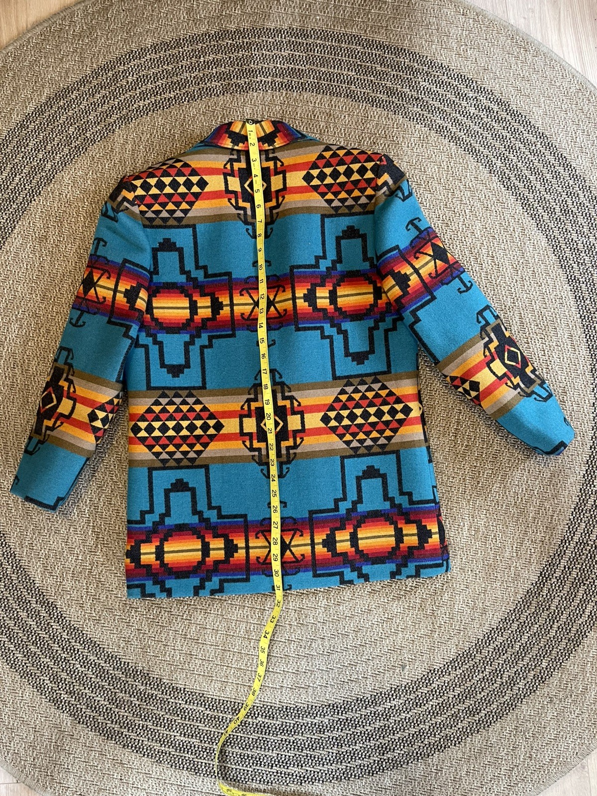 A vibrant vintage Pendleton Knockabouts jacket featuring a bold Southwestern Aztec pattern. The jacket showcases a colorful geometric design with a tailored fit. Size small. Measurements: Shoulder to shoulder: 16.5 Pit to pit: 20.5 Sleeve: 21