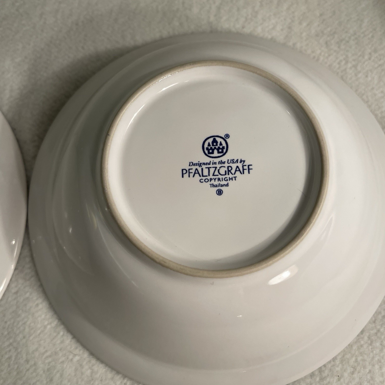 This product is a set of two vintage Pfaltzgraff Blue Isle salad or cereal bowls, featuring a beautiful blue and green leaf pattern. Made of stoneware, these round bowls are part of the Blue Leaf product line, with a contemporary style and art pottery production style. They are microwave and dishwasher safe, with a printed backstamp indicating their original production. Perfect for all occasions, these bowls have a height of 2 inches and a width of 7 inches, making them a charming addition to any table setting. Excellent condition. No chips or cracks.
