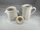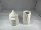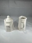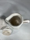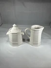 This vintage Pfaltzgraff Heritage White Creamer and Sugar Bowl with Lid set features a classic white stoneware design with a glossy finish. Handmade in the United States using pottery production technique, this original set includes three items, each measuring 5 inches in height. With features like handles and dishwasher-safe convenience, this Pfaltzgraff Heritage set is a charming addition to any kitchen or dining collection, perfect for serving cream and sugar in style. A true vintage find for collectors of decorative cookware and serveware.