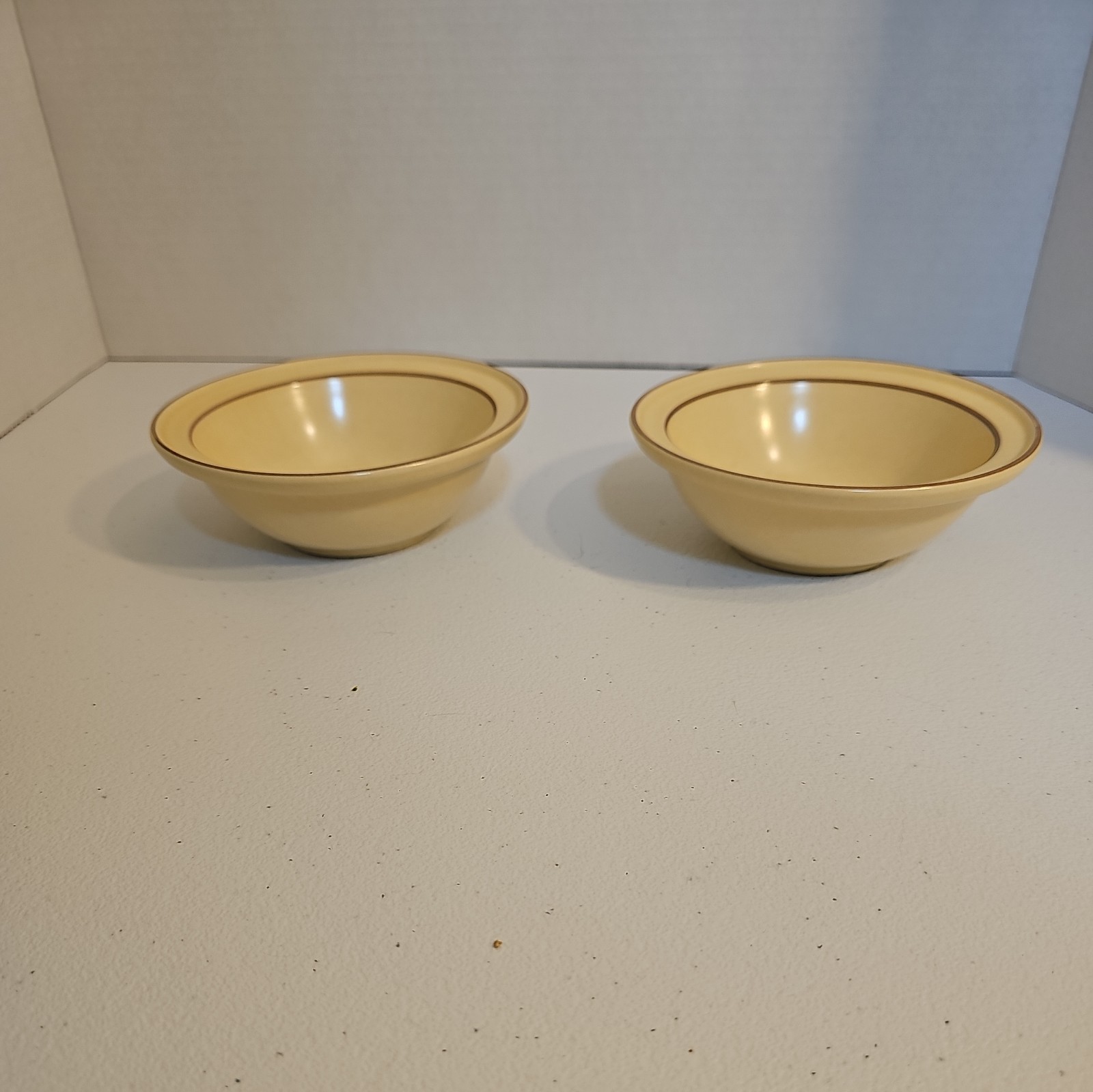 Crafted by the renowned Pfaltzgraff, this set of two small dessert and fruit bowls brings a touch of vintage charm to any table setting. The brown floral design on cream stoneware is a classic representation of the 1970s aesthetic, perfect for those who appreciate the craftsmanship of the era. Each bowl measures 5.25 inches in width, making them ideal for serving individual desserts or fruits. The Pfaltzgraff Village pattern is a beloved staple, boasting a round shape that fits comfortably in the hand. These bowls are an original contemporary production from the 1970s, complete with an impressed backstamp authenticating their quality. Whether used for special occasions or as a permanent addition to your dinnerware collection, these bowls are sure to impress.