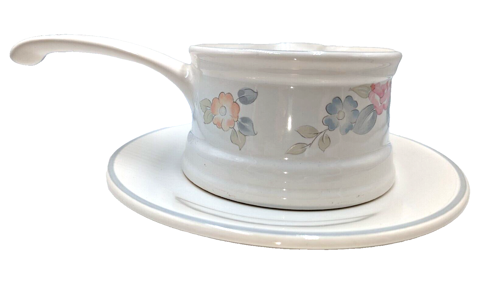 Vintage Pfaltzgraff Wyndham Gravy Boat w/Underplate American Made Stoneware. One issue - there is one chip, rather small, on the bottom of the gravy boat. The chip would not affect the use of the bowl. Otherwise no damage - please see the photos. All of my items are carefully packed for shipping, no matter their value - $5 items are wrapped with the same care as a $200 item. My goal is to have your purchase arrive safely. Large, heavy and fragile items are harder to use combined shipping with but just ask if you would like to purchase more than one item and I am more than happy to do so if feasible. Measurements are approximate or as close as I can get. Also, the color you see many not be the exact color depending on your computer or phone settings. Unpaid items will result in the buyer being blocked from further purchases. Please remit payment right away so we can get your item shipped out quickly.