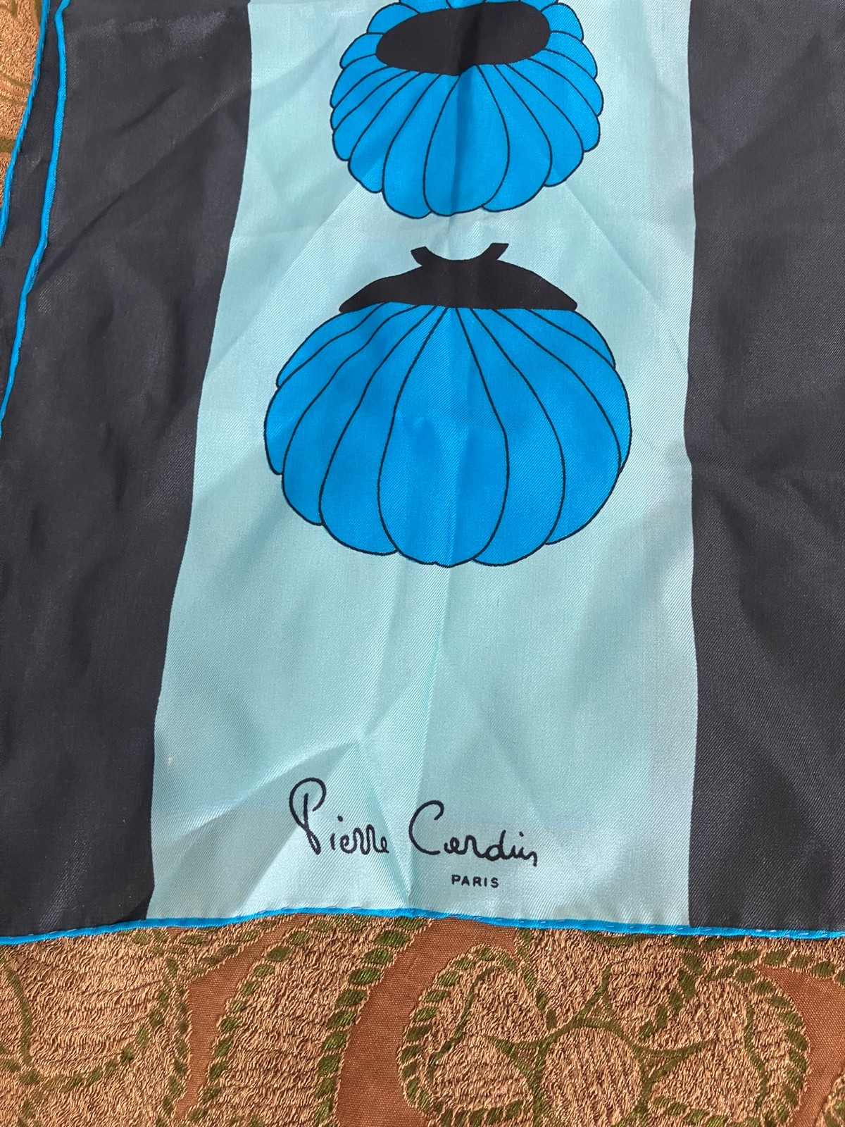 STUNNING and RARE vintage designer silk scarf by legendary French couturier PIERRE CARDIN ! This striking oblong scarf features an iconic mod/pop art flower design in beautiful shades of blue, exemplifying the bold, geometric aesthetic that made Pierre Cardin a fashion icon of the 1960s-1970s era. Designer & Authentication: Designer: PIERRE CARDIN Paris (signature clearly visible) Made in: France Material: 100% Pure Silk (Soie Naturelle) Size: 40" long x 10" wide (oblong/skinny scarf format) Label: Original care tag present confirming 100% silk About PIERRE CARDIN: Pierre Cardin (1922-2020) was one of the most influential fashion designers of the 20th century. A pioneer of Space Age fashion and geometric designs, Cardin revolutionized the fashion world with his avant-garde, futuristic aesthetic. His designs from the 1960s-1970s are highly collectible and represent a significant moment in fashion history. Pierre Cardin accessories, especially silk scarves from this era, are sought-after by collectors worldwide. Design: MOD POP ART FLORAL This scarf perfectly captures Pierre Cardin's signature bold, graphic style: Pattern: Center panel featuring graduated stylized flowers/pom-poms Flowers range from small to large, creating dynamic visual flow Graphic, almost architectural flower petals with clean black outlines Black centers creating dramatic contrast Color Blocking: Center Panel: Light sky blue background Side Panels: Charcoal gray/dark navy Flowers: Vibrant bright blue with black centers Trim: Bright blue piping/edge detail Design Era: Classic 1960s-1970s mod/pop art aesthetic with geometric precision and bold color contrasts characteristic of the Space Age fashion movement Condition: GOOD VINTAGE CONDITION Light small stains present (please review all photos carefully) Overall excellent colors with beautiful sheen No tears, holes, or major damage Silk remains soft and lustrous Edges clean and intact Normal vintage wear consistent with age Size & Versatility: The 40" x 10" oblong format is incredibly versatile and on-trend! This slim, elongated shape is perfect for: Wearing Styles: Long neck scarf (multiple tying techniques) Headband or hair wrap Belt or waist sash Bag handle wrap or bag charm Wrist tie Choker-style neck wrap Western/cowboy style neck tie Fashion Coordination: White t-shirt and jeans for effortless French chic Black turtleneck for dramatic mod look Denim jacket for retro cool Navy blazer for sophisticated preppy style All-white outfit for pop of color Perfect For: Designer Collectors: Pierre Cardin is a blue-chip collectible name Vintage Fashion Enthusiasts: Authentic 1960s-1970s mod style Pop Art Lovers: Graphic, bold aesthetic French Fashion Aficionados: Iconic Parisian designer Gift Giving: Museum-quality fashion piece for collectors Mid-Century Modern Style: Complements MCM interiors and aesthetic Historical Significance: Pierre Cardin scarves from this era represent a pivotal moment in fashion history when designers embraced geometric, space-age aesthetics. The bold graphic florals and color blocking in this piece are quintessential Cardin - instantly recognizable and eternally stylish. Collector's Notes: Pierre Cardin accessories are increasingly valuable as the designer's legacy grows Authentic vintage Cardin pieces from the 1960s-1970s are becoming harder to find The mod floral motif is a classic Cardin design element Made in France provenance adds authenticity and value 100% silk with original labels enhances collectibility Care: Professional dry cleaning recommended for vintage silk Can also hand wash gently in cool water if needed Store flat or loosely rolled Keep away from direct sunlight to preserve colors Provenance & Value: Pierre Cardin's influence on fashion cannot be overstated. His bold, futuristic designs made him one of the most recognizable names in fashion history. Owning an authentic vintage Pierre Cardin silk scarf is like owning a piece of fashion history - these pieces are increasingly sought after by museums, collectors, and fashion enthusiasts worldwide.