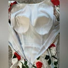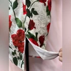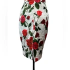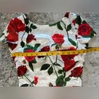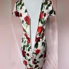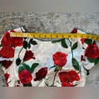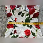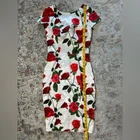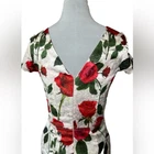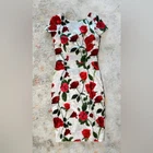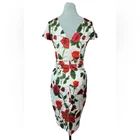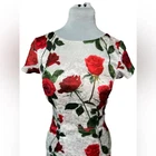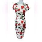 Stunning Vintage Pin-Up Inspired Red Rose Fitted Wiggle Dress! In excellent condition. A gorgeous dress that demands attention. Built in bra cups Round neck V back Zip closure Polyester blend Size M Approximate measurements in pics A great date dress, photo shoot dress, cocktail dress.