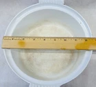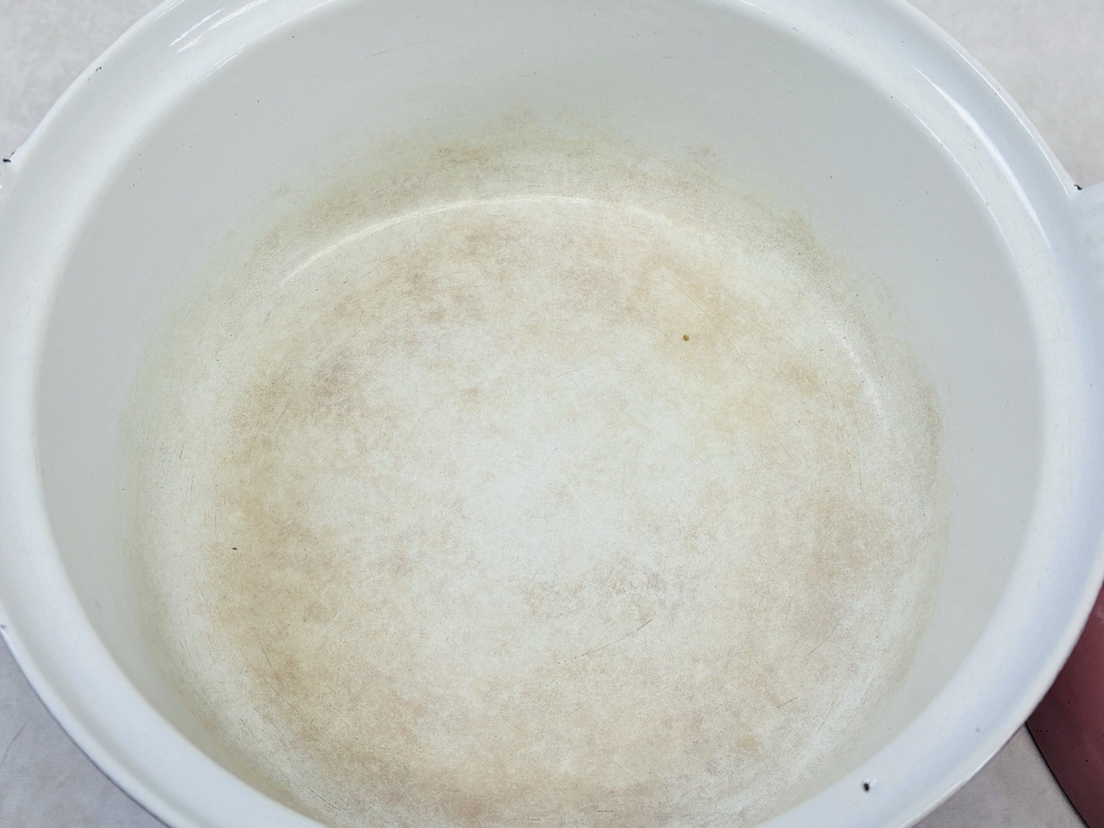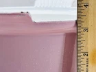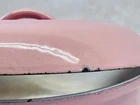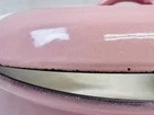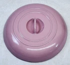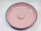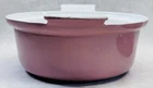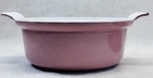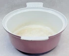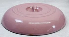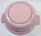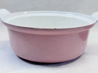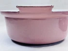 Vintage pink enameled cast iron Dutch oven 22 cm ribbed handles mid century This charming mid century enameled cast iron Dutch oven features a soft pink exterior with ribbed white handles and a matching lid with concentric rings. The bottom is marked 22 and measures approximately 8.5 inches across rim to rim and about 3.25 inches tall. The interior is white enamel with age related discoloration. There are enamel chips and wear along the rim, lid edge, and handles as shown. The exterior has white speckling throughout which appears to be part of the original finish. A wonderful functional or display piece for retro or mid century kitchens. •Era: Mid century •Material: Enameled cast iron •Size: Approx. 8.5 inch diameter, 3.25 inch height •Markings: 22 on bottom •Color: Pink with white interior •Features: Ribbed handles, matching ringed lid •Condition: Age wear, enamel chips, interior discoloration •Use: Cooking, décor, display Ships securely.
