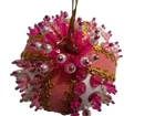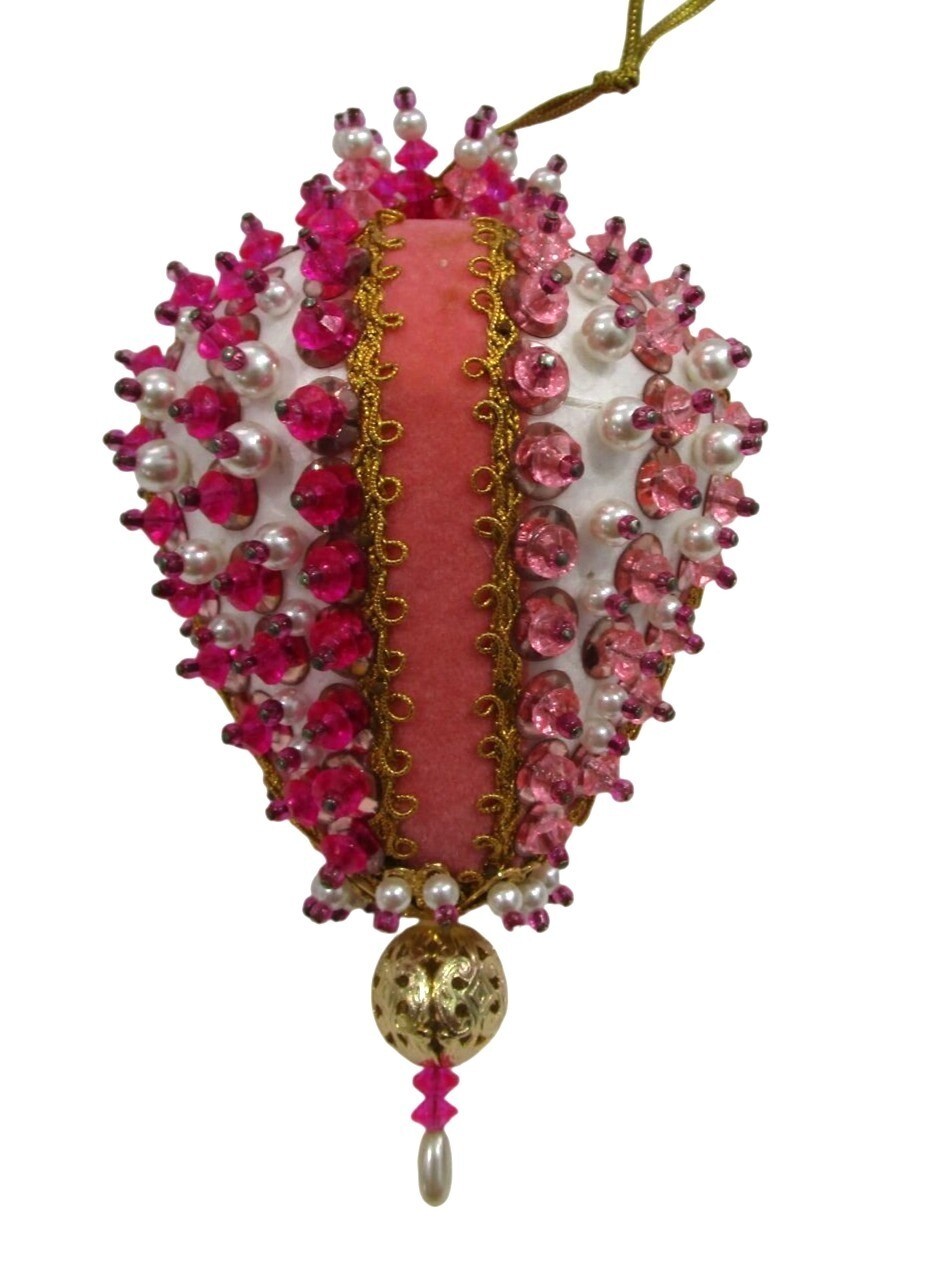 This intricately designed hanging ornament exudes elegance with its vibrant pink and white hues, accented by shimmering gold trim and delicate pearl embellishments. Its meticulous beadwork and unique craftsmanship make it a stunning addition to festive settings or year-round decorative displays. This piece radiates sophistication and charm with a touch of vintage allure. Pink and fuchsia pin beaded tear drop ornament with pink velvet accents. Pins pushed into Styrofoam between the ribbon. May show missing rhinestones, beads and pins. Shows smudges. May show defects in manufacture and decoration. • Gold hanging loop for easy display • Features pink and white beaded detailing • Ornate golden accent with pearl embellishments • Lightweight yet durable design • Unique handcrafted aesthetics Condition: Pre-Owned Good May show missing rhinestones, beads and pins. Shows smudges. May show defects in manufacture and decoration. The Fine Print * Questions Welcome! * YES! I ship to APO/FPO. Thank you for your service! * I do ship internationally, buyer responsible for all fees, duties, and/or taxes. * I WILL NOT falsify customs and/or import forms. * Packages valued at $100.00 USD, or more, will be shipped signature required. * Please pay promptly. * Unpaid item cases are opened and closed automatically. *** Returned Items Must Be In Same Condition As Shipped To Include All Security Tags Intact and Attached*** Any Props, Plate Stands, Hangers, Shoe Trees, Backdrops, Risers, Dress Forms, Mannequins, Measuring Devices, Thumbs or Fingers Shown In Photos Are Not Included. Only the Item Described Is Included